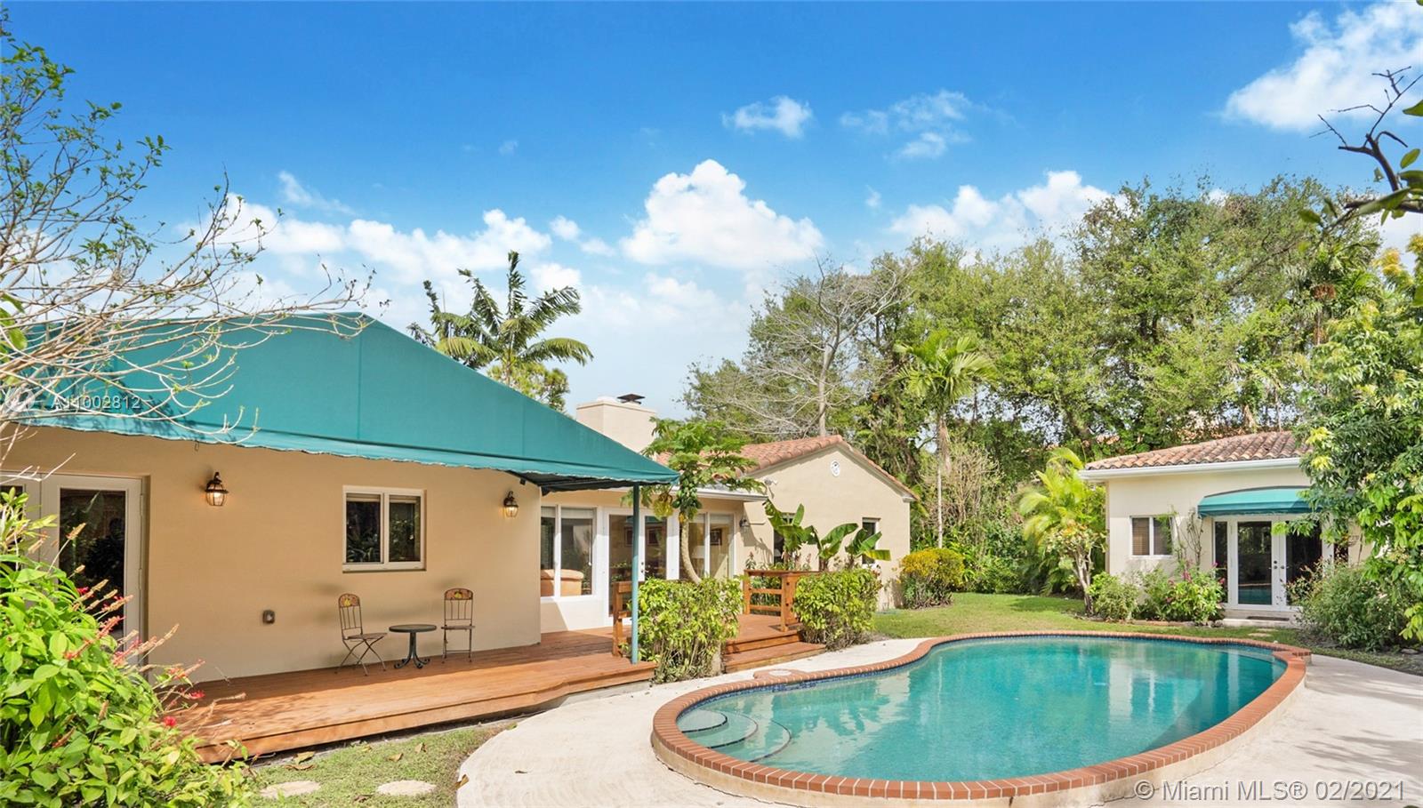 Located in a Prime Coral Gables location, behind a privacy wall, this 4 bd, 3 bath residence w/ cottage is on a quiet, low traffic street. The 12,000 sq. ft. lot is laden w/ exotic plants & fruit trees. Garden vistas from every rm. Charming details are exemplified by hardwood floors, fireplace in living rm & gabled ceiling in fam rm. Modern features incl Impact windows/doors/barrel tile roof. Large updated kitchen w/ granite countertops/island/ breakfast bar/eat in area/home office ideal for a family. Home offers a split plan: Master on west side features Bay window/window seat/ample closets. 3 bdrms & 2 baths on east side. The 592 sq ft cottage features high ceilings, saturnia flooring, large liv area/Murphy bed/full bath/kitchen & office space. All cast iron pipes have been replaced.