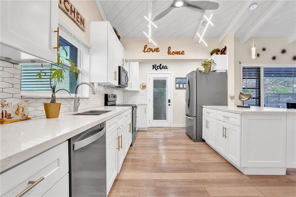 Tranquil Oasis in Sought after Rio Vista. Completely updated and renovated in 2020. Gorgeous open floor plan with high exposed wood beamed ceilings, cabana bath, private outdoor courtyard cafe with brick patio. A resort like feel is evident with the breezy landscaping and outdoor saltwater pool system equipped with solar heater and electric heat pump system that you can enjoy on the spacious patio area with an outdoor kitchen. Unique to the neighborhood ranch-style home with 3 bedrooms, 3 baths and a 2 car garage, Located on a rarely available corner double lot! All underground sewer piping replaced in 2019. Tented for termites in 2020 with transferable warranty. This is a beauty!!! Bring all offers.