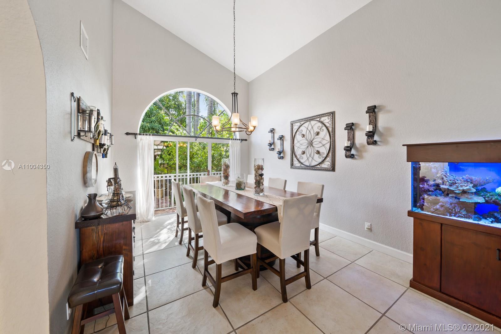 Elegant home featuring vaulted ceilings lots of natural light from the arched windows, spacious living area. Remodel kitchen with stainless steel appliances all the comforts of a luxury home, including a wine cooler, all wood cabinets with under light, spacious pantry area and room for a breakfast table. Florida room opens access to the patio 1 full bath and laundry room on 1st floor Beautiful wooden stairway takes you to 2nd floor 1 Master and 3 more comfortable bedrs. The back yard is paved ,electrical awning including cozy landscaping with fruit trees and exotic plants, custom made aviary to enjoy nature and relax with the family. Impact windows & accordion shutters, 2 car garage with an extra refrigerator, 2 new AC units. Low HOA $219 Gated