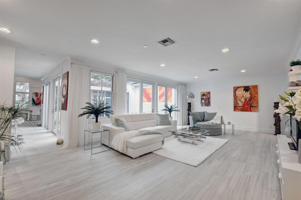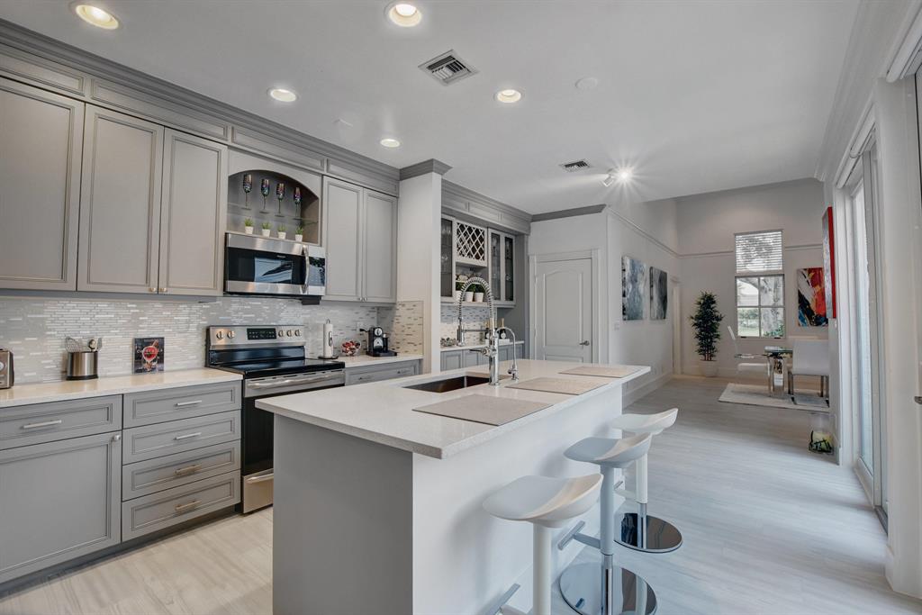 This cheery townhome with tranquil lake views remodeled in 2019 with contemporary flair in white & gray tones offering 3 bedrooms & 3 1/2 baths is light, bright & spacious offering wood grain porcelain tile floors throughout; freshly painted flat walls & crown moldings; an open kitchen with 42''gray cabinetry with roll-outs, quartz countertops, glass tile backsplash, stainless steel appliances & a butler's pantry; tastefully remodeled Master & secondary bathrooms with new vanities & toilets; newer washer & dryer; impact glass sliding glass doors around an inviting courtyard with open & screened patio areas on the lake & more. A/Cs - 2015, 2020. And this home can even purchased furnished / turnkey -- just move right in!