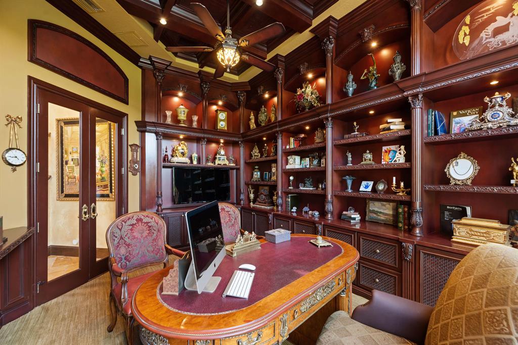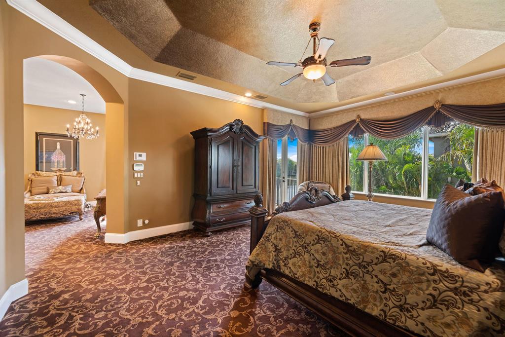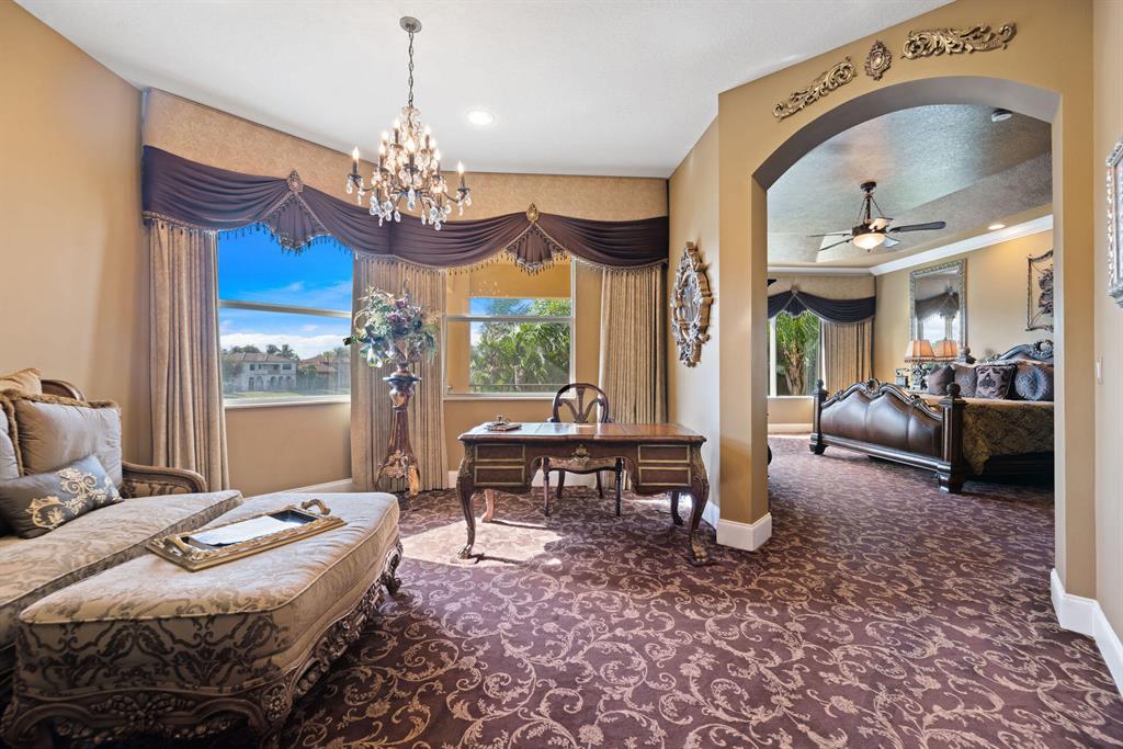 This exquisite waterfront estate awaits you. Situated in one of Boca Raton's most exclusive communities, The Oaks! Built by Gordon Homes in 2006 w/ a well-planned 8,113 total Sq Ft. floorplan and over 6,500 Sq Ft under air. 6 bedrooms + office + a home theatre & 6.2 baths. Upgrades include: Full hurricane impact glass protection, custom built-ins & finishes, Jerusalem marble floors throughout w/ the exception of the bedrooms which are carpeted, & stereo surround sound. Downstairs: 2 bedrooms + a stunning office w/ custom built-ins overlooking the tranquil setting of the beautiful pool & lake.Just off the spacious kitchen & formal dining, there's a beautiful wet bar w/ small SubZero fridge. Elevator ready! Upstairs, the spacious & elegant master suite with a separate sitting area, private