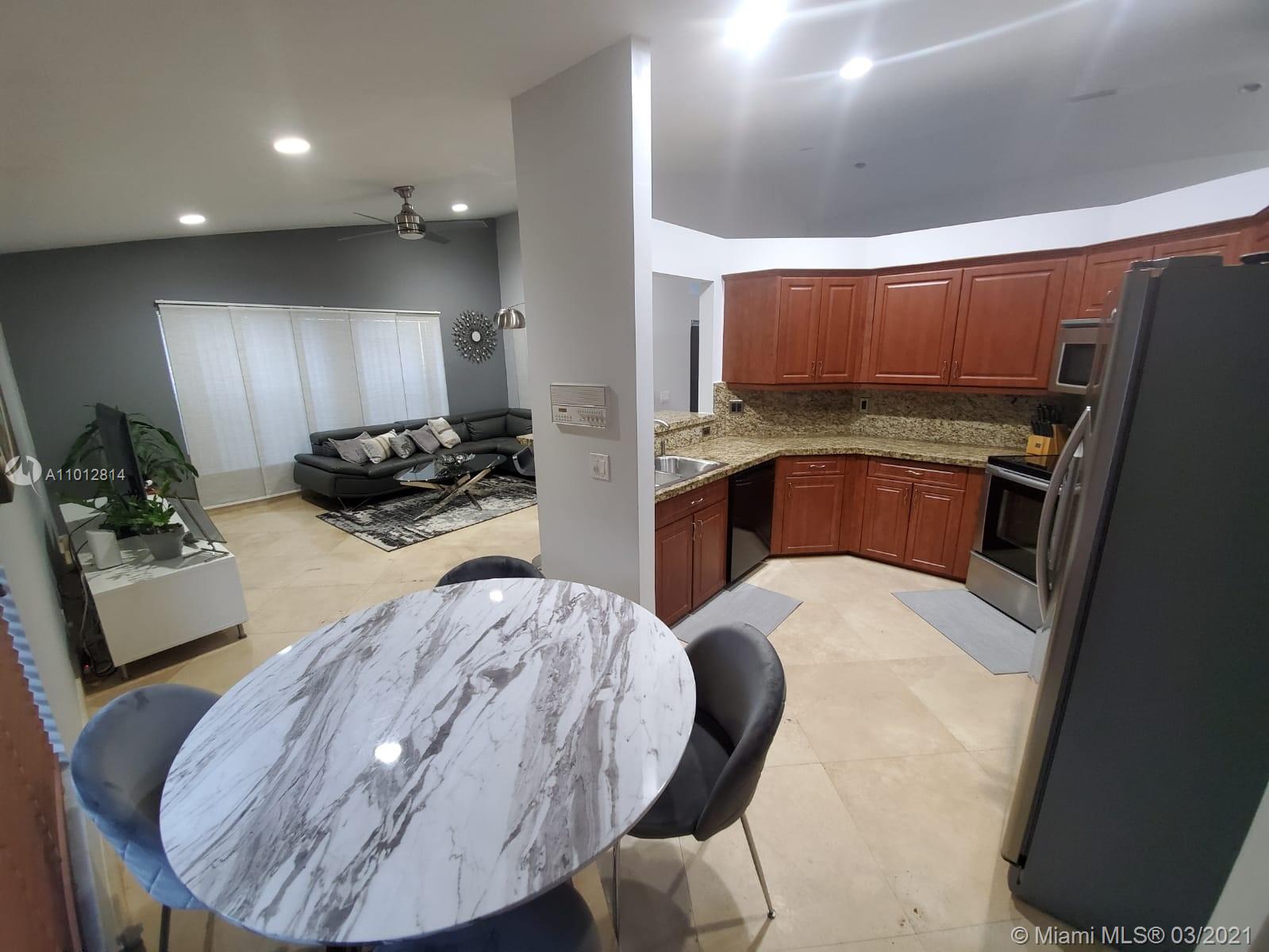 Beautiful 4 Bed 2 Bath Home in North Lakes Weston. Travertine Floors, High Ceilings with LED Lights, Kitchen with Granite Countertop and Stainless steel appliances. Big open Living room, Big Master Bedroom and Master bath with Shower/Bathtub combo and dual vanities. Very nice and quiet paved and screened enclosed patio with plenty of room to add amenities and entertain. Recently outside Paint and refreshed inside Paint.