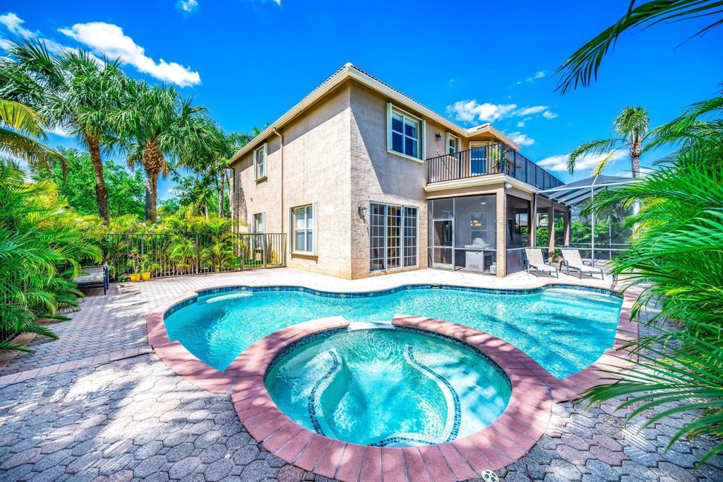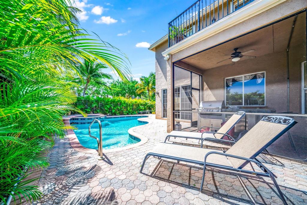 One of a kind opportunity to own a beautiful two story home with a pool and water view in the sought after community of Saturnia! Come see this spacious 5 bedroom, 4 bath Chateau Lafite model including a den off the master bedroom, and a 3 car garage. Gorgeous wood floors throughout the main living areas and carpet in the bedrooms. The gourmet kitchen features wood cabinets with plenty of storage, granite countertops, stainless steel appliances, including a double oven, and a built in custom breakfast nook along the bay window. Perfect for entertaining as the kitchen flows into the large enclosed veranda with new summer kitchen overlooking pool and lake! Surrounded by lush landscaping, enjoy the privacy of being a corner home, while also walking distance to the clubhouse.