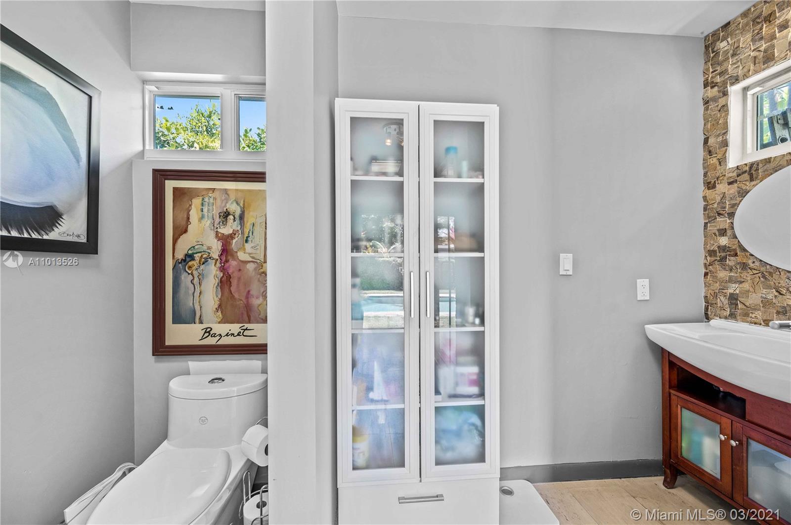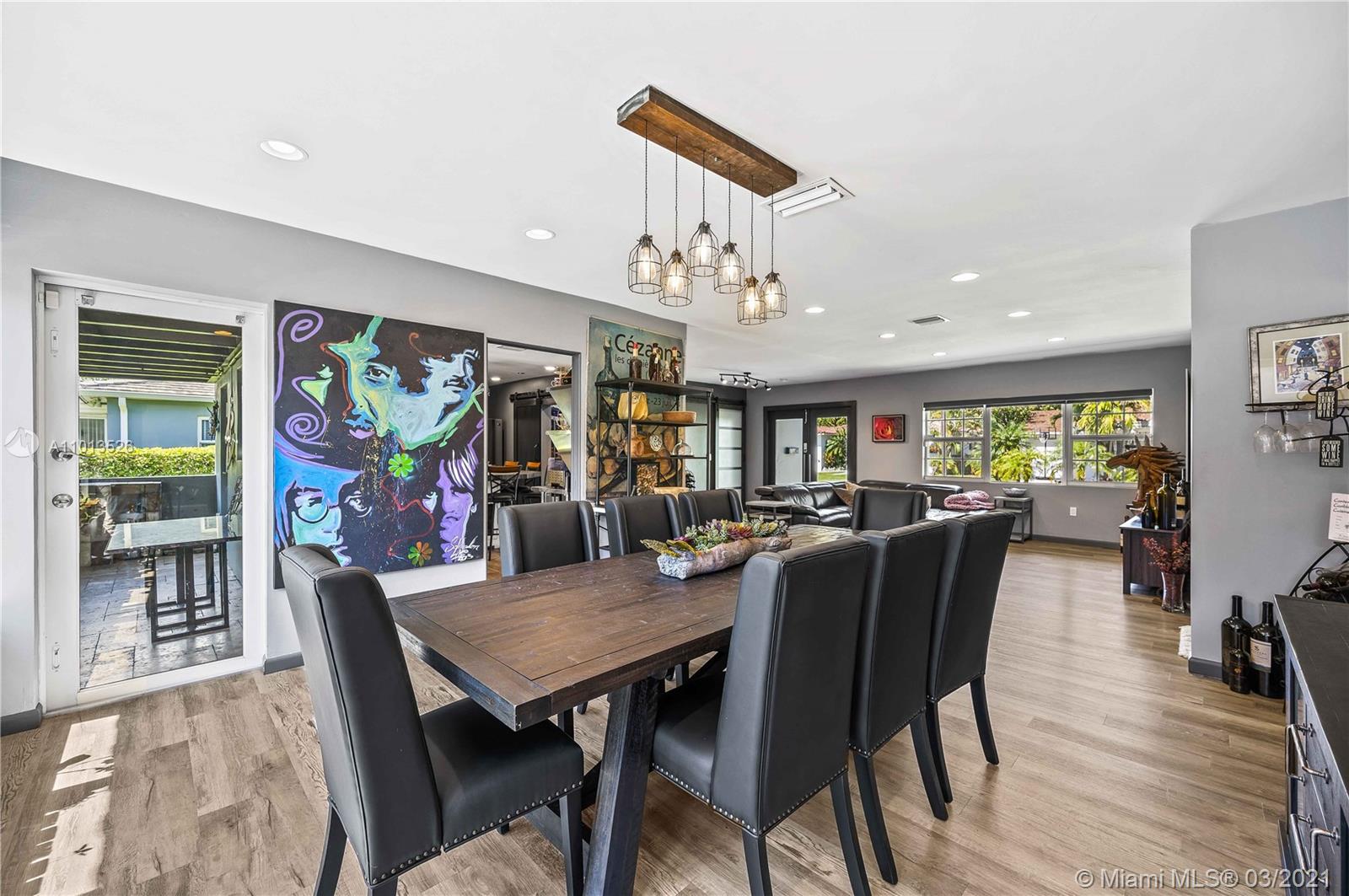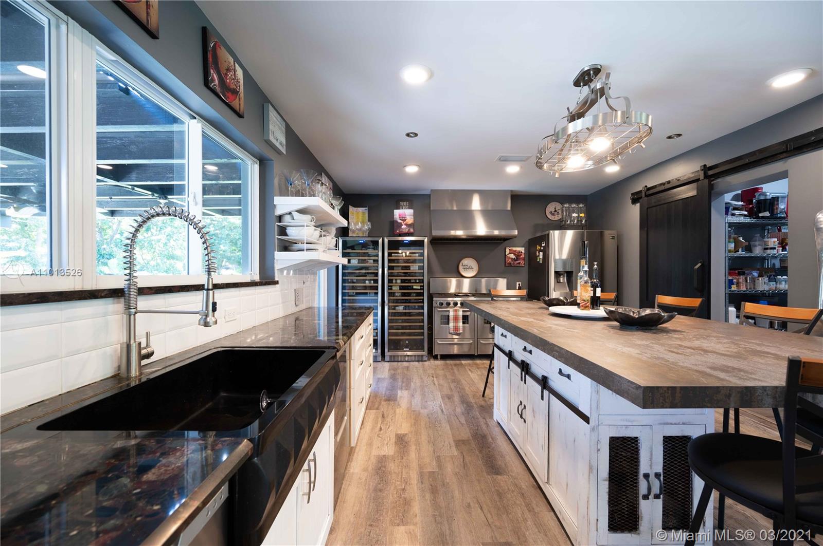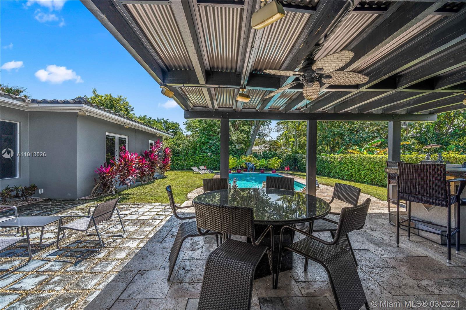 Updated mid-century modern east of Biscayne Blvd in highly desirable Miami Shores neighborhood. This property has been transformed into an entertainer's delight w/ open concept & elevated indoor/outdoor living concept. Interior features include true chef's kitchen w/ Five Star gas range, cast iron grill/griddle, dual wine-coolers, professional exhaust hood, walk-in pantry, & custom kitchen island that comfortably seats six. The open kitchen communicates comfortably w/ the living room & formal dining area, which looks out over the alluring pool terrace. For dining al-fresco, the exterior pergola & outdoor BBQ help to create the ideal atmosphere for enjoying the outdoor space with friends & family. Master-BR wing features an office area, large walk-in closets & more. Impact glass throughout.