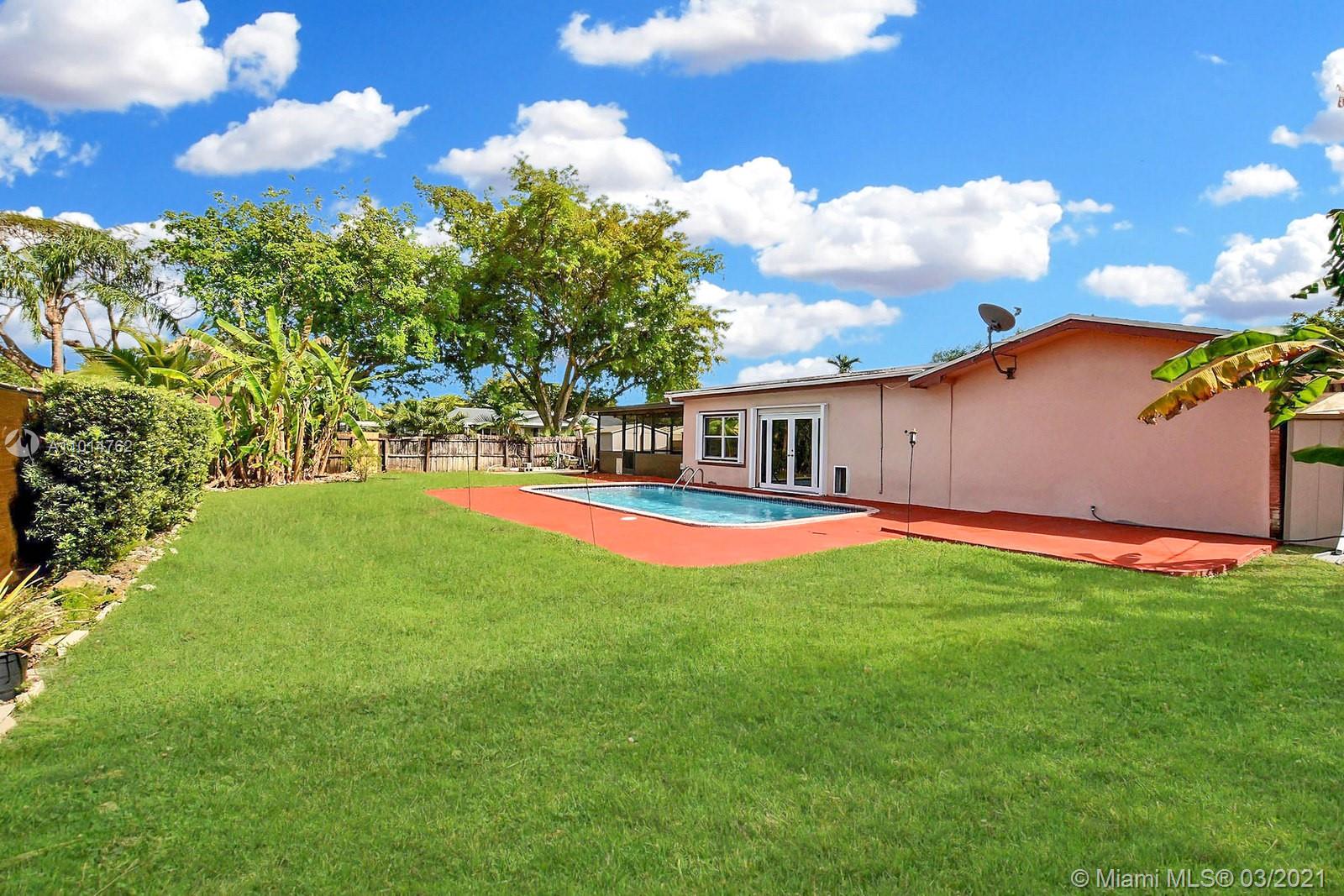 SPACIOUS ONE STORY RANCH STYLE POOL HOME IN PLANTATION WITH OVER 2,900 FT UNDER AIR. WELL-MANICURED GROUNDS & CIRCULAR DRIVEWAY W BEAUTIFUL CURB APPEAL. HOME FEATURES DOUBLE DOORS TO LARGE LIVING AREA GREAT FOR ENTERTAINING. KITCHEN HAS WOOD CABINETS, STAINLESS APPLIANCES INCLUDING 6 BURNER GAS RANGE & HOOD SURE TO APPEAL TO YOUR INNER CHEF. LARGE FAMILY ROOM W CHARMING FRENCH DOORS OPENS TO THE POOL & PATIO AREA TO ENJOY THE SOUTH FLORIDA INDOOR/OUTDOOR LIVING LIFESTYLE. SPACIOUS PRIMARY SUITE W ENSUITE BATH HAS DOUBLE VANITY, SEPARATE TUB AND SHOWER. BEAUTIFUL CORNER LOT WITH REFRESHING POOL AND SCREENED IN PATIO. AIR CONDITIONED GARAGE W/ STYLISH EPOXY FLOOR USED AS FLEX SPACE IS PERFECT FOR HOME GYM, PLAYROOM, MAN CAVE OR CRAFT ROOM. ACCORDION SHUTTERS, NEW AC & WATER HEATER. NO HOA.