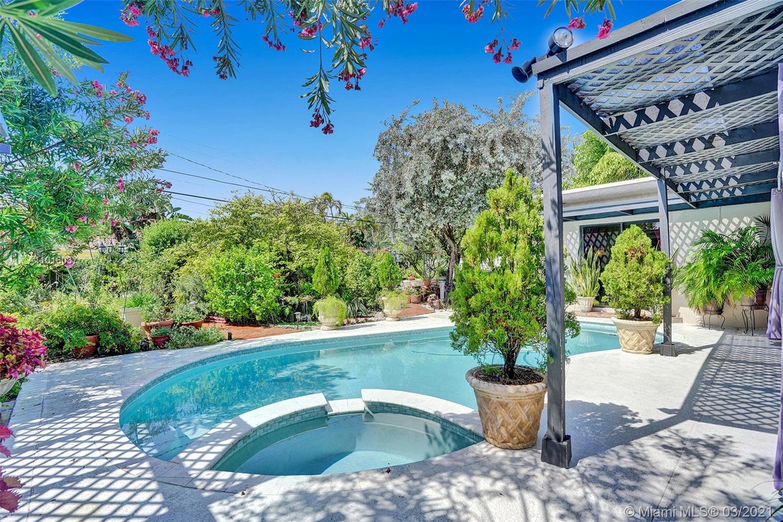 Enjoy your privacy and a fabulous backyard / tropical garden in this house located in a quiet street in a gated golf course community in Normandy Island and Miami Beach Just few blocks from shopping, dining, parks and public transit. The spacious kitchen has been upgraded with granite counters and stainless steel appliances, and dining and living areas are extremely spacious. All high impact windows. Florida room open through a fully fenced backyard with large patio, heated pool, Jacuzzi and a lush tropical garden. One-car attached garage and room for three more cars in the driveway.
