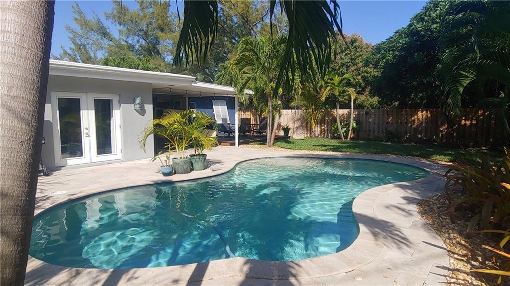 This CORNER LOT home is a tropical oasis, less than 1 MILE TO THE BEACH. A private and fully fenced backyard featuring a covered patio, elevated wood deck, and travertine pave pool area with accessible full bath. Double french doors connect the dining room and kitchen to the open back patio ideal for indoor / outdoor living and entertaining. Light filled split floor plan. Separate pantry and laundry room , brand new tank-less water heater, washer and dryer. Expansive front yard with full corner loaction. Cover porch, concrete driveway suitable up to four vehicles. Bedroom windows have Bahama shutters while still allowing natural light to flow in. Location puts you near every amenity, while offering a private and relaxed single family living experience.