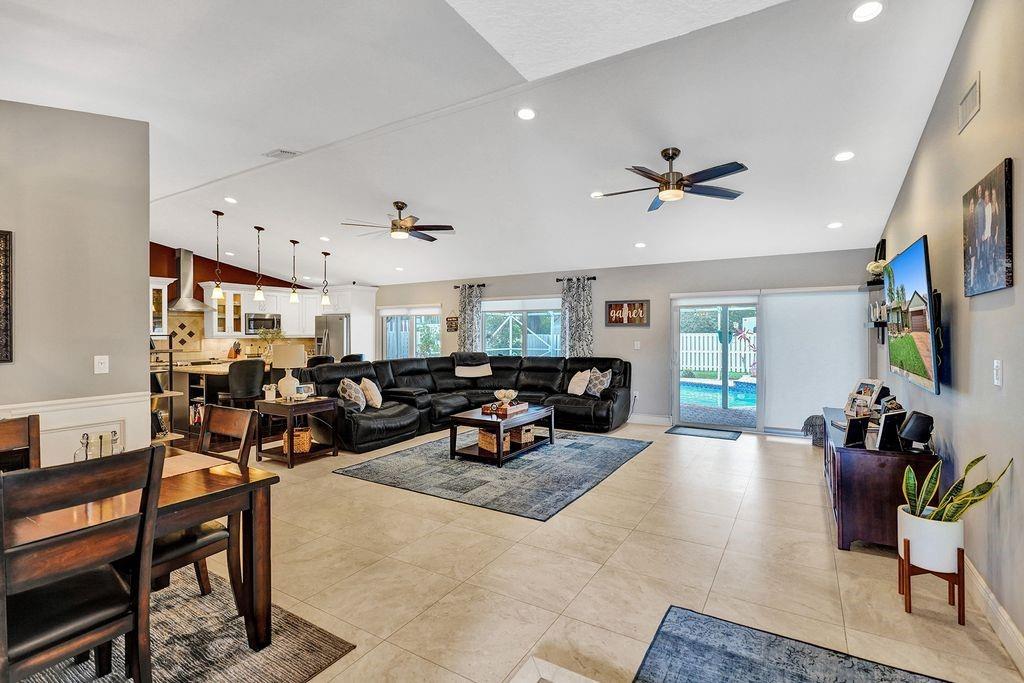 Substantially and tastefully remodeled; beginning with the expertly designed and meticulously maintained tropical landscaping, custom stamped concrete driveway with matching patio and poured concrete flower beds, premium stack stone accents on the facade, handmade mailbox with stone, and all hurricane impact windows and doors including skylight. Open living area with vaulted ceilings, custom kitchen complete with seamless premium granite, soft close cabinets and drawers with brushed aluminum fixtures, under cabinet lighting, properly ventilated stainless steel range hood, stainless steel appliances and glass top stove, dual pantry with pull out shelving, lazy susan, and wood plank style ceramic tile, 5x8 island bar. MBR walk-in closet, dual sinks + frameless glass shower door... cont. supp