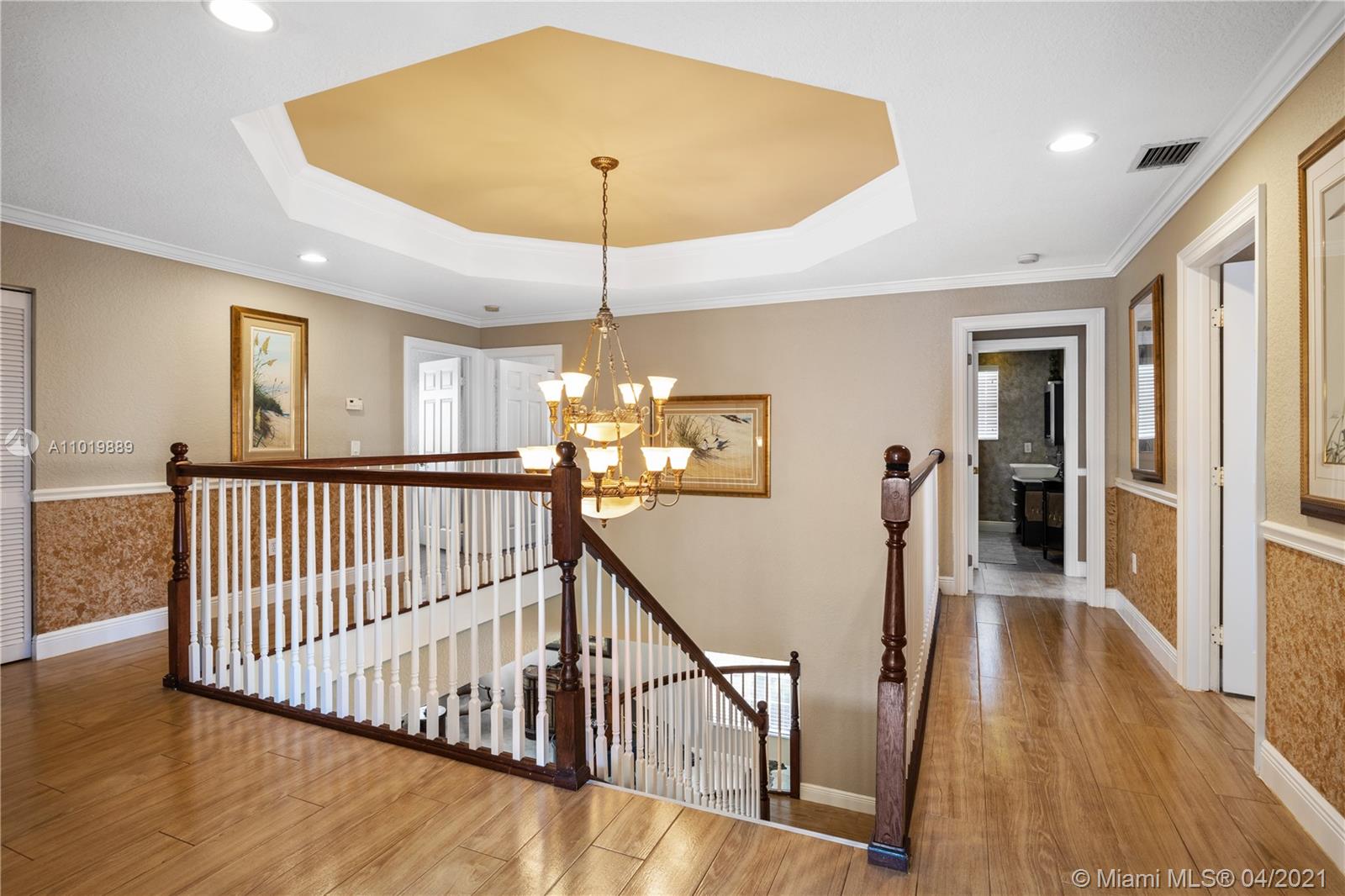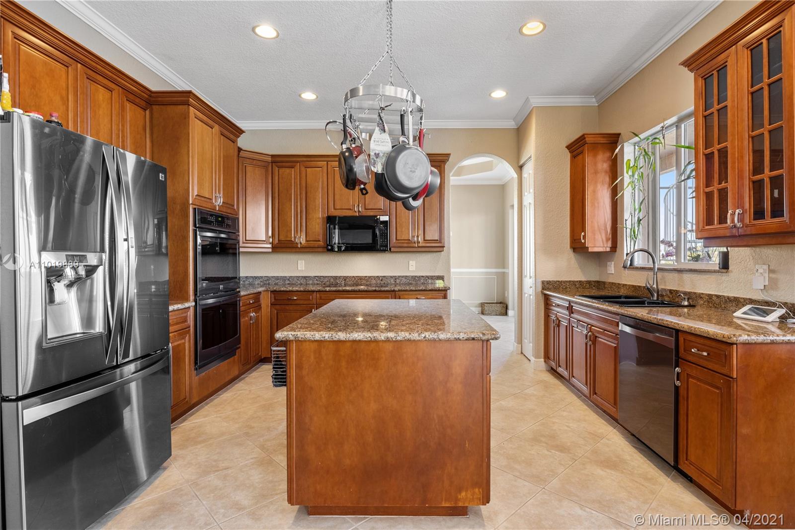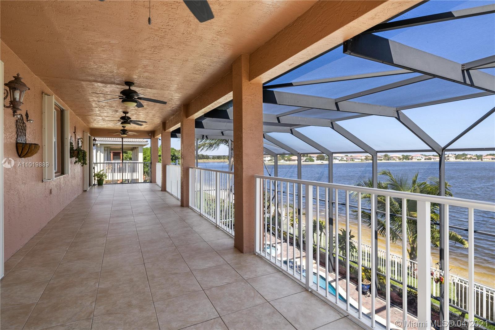 Stunning home with heated pool and panoramic lake view! Guest bedroom with private bathroom downstairs. Large upgraded gourmet kitchen with wood cabinets, center island, newer SS appliances, and granite counter top. 2 large master suites with walk-in closets and access to huge balcony with amazing views. Upgraded bathrooms, high vaulted ceilings, ceramic & porcelain flooring, crown molding, recessed lights, grand staircase, propane generator, laundry room with newer full size washer & dryer, accordion shutters. Relaxing backyard with breathtaking lake view, pool/Jacuzzi (pool has newer Diamond Brite refinish) and summer kitchen; perfect for entertaining! Garage flooring with newer Epoxy flooring coating and storage cabinets. Resort style club house with lots of amenities. Must see!