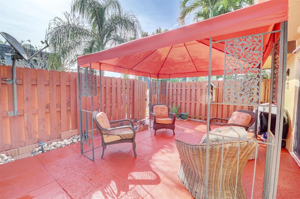 This charming townhome is waiting for you to make it your own! Private courtyard made for entertaining with concealed shed for extra storage on the side of the unit. New interior paint, ceramic tile, crown molding, updated ceiling fans, lever door handles, and new blinds. Kitchen has snack counter and pantry. Updated bathroom and shower with glass door, an imported sink from Mexico on first floor. Oversized sliders let in lots of natural light and expand your entertaining space. Hard wood floors on staircase and throughout second floor. Newer A/C and thermostat, complete set of hurricane panels, spacious master bedroom with wall to wall, floor to ceiling closets. Large secondary bedroom with built in bookcases, lots of closets and storage space. Upstairs bath has double vanity sinks with