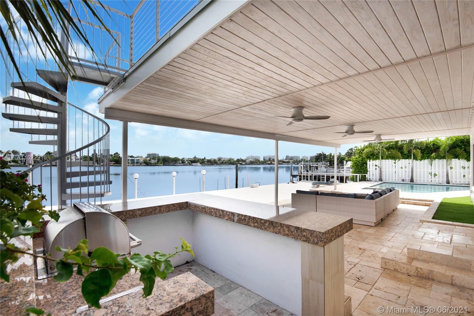 Welcome to 1055 Stillwater Drive. Miami Beach's best-kept secret, and visit this 7 bedrooms 5 bathrooms waterfront home sitting on a large 11764 Sq. Ft lot. a luxurious guard-gated Island in Miami Beach. You'll be in love with the panoramic open bay view. This beautiful home boasts 78 FT water frontage. Bring your boat, jet ski, kayaks and enjoy the waterfront Miami Beach lifestyle. This spacious two-story home features two master suites, a private one on the second floor with an extra-large porch to enjoy breathtaking views of Indian Creek, Biscayne Bay, and Surfside Skyline. Watch the dolphins and the manatees right at your feet. The outdoor porch offers spacious sitting and lounge areas some of them nicely covered to enjoy this lifestyle during summer and winter days.