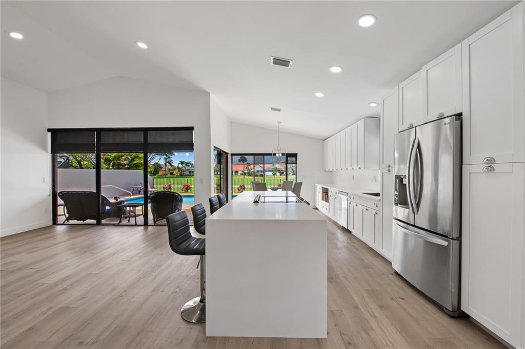 Gated Boca Woods Country Club. This exceptional updated three bedroom, two bath, pool home on an oversized lot is located on highly desirable Crystal Lake Drive. This property features a new roof 2018, year and one half old a/c and duct work. Beautiful bright, spacious open living space with vaulted ceilings, eat in open kitchen with an oversized island, quartz counter tops, SS appliances, great room, dining area. Enjoy relaxing on the patio with the phantom screen either up or down while overlooking the pool, golf course and lake view. Boca Woods Country Club offers two 18 hole golf courses,driving range,putting green,tennis,fitness center,pool,pickle ball,dining.Mandatory membership $65,000 paid 10 days prior to closing,$30,000 refundable when you sell home. See attachment