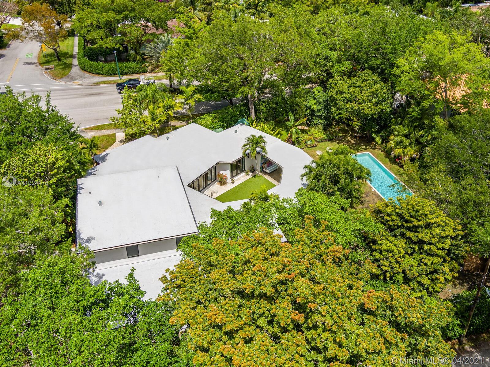 Welcome to The Panorama House! Recently renovated sprawling Mid-Century Modern marvel by noted architect, Joseph De Brita. Cleverly designed on a 1/2 acre corner lot, it wings out to an expansive hexagon-shaped loggia and stunning lush gardens with new sparkling 42’ pool with sun shelf. So much room to relax or entertain! Great layout and authentic character: eat-in Italian designer kitchen, split bedroom plan, new luxurious spa-like master suite retreat, plus preciously-preserved Instagram-ready vintage baths, a bonus guest suite and a 468 SF screening room! Feels like an exclusive boutique hotel with Andy Warhol wallpaper, Wynwood Walls-inspired custom murals by top artists and a forest of edible trees. New roof (2021). Experience your own private sanctuary in the heart of Miami Shores!