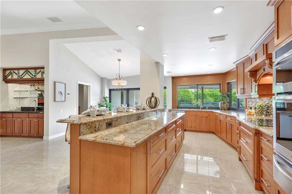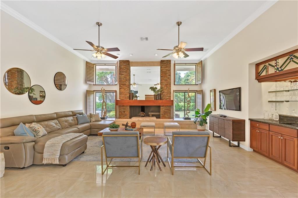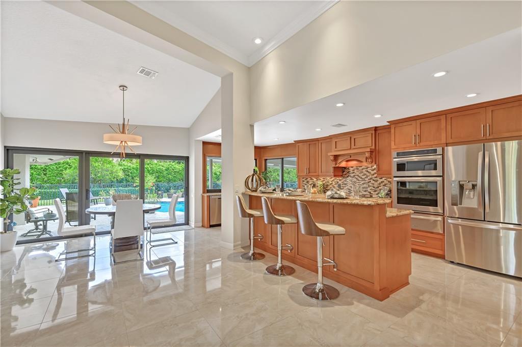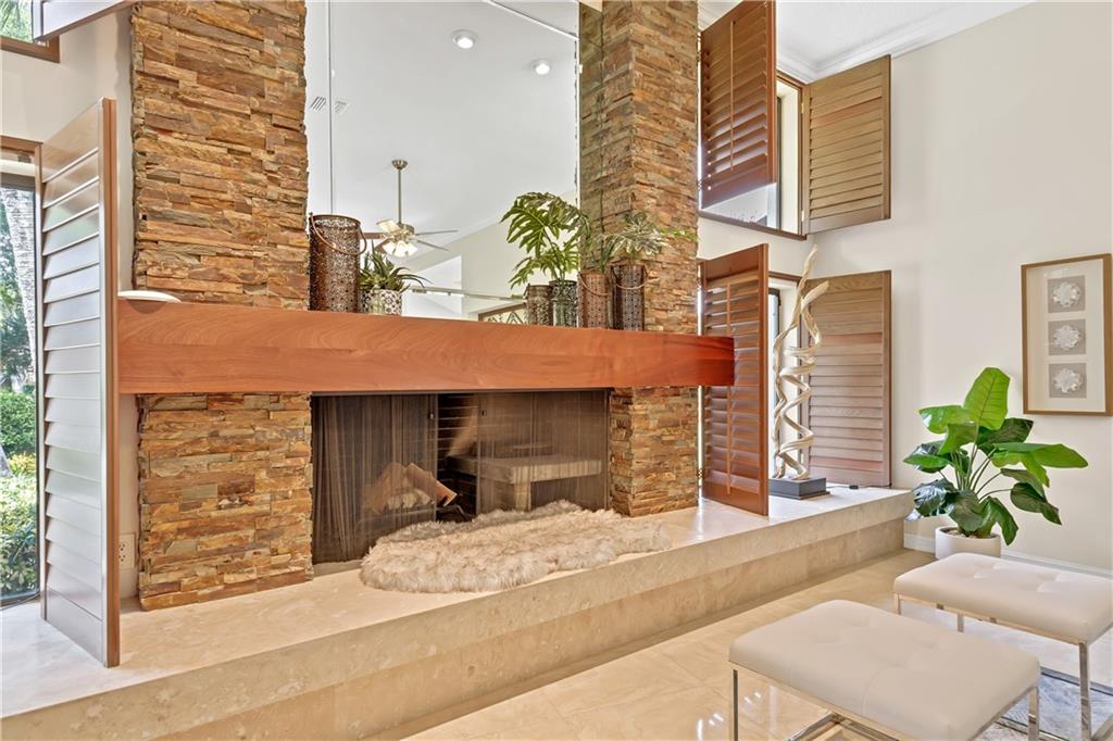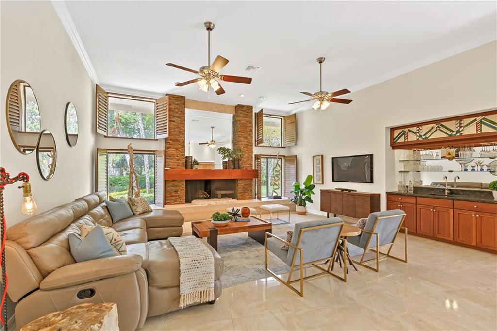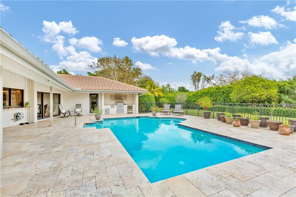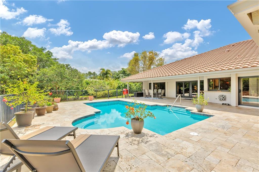 This home exudes Fine Details: Plantation Shutters, Crown Molding, Wet Bar, Travertine Pavers, Porcelain Tile, Clerestory Windows, Plant Shelves, Stacked Stone & Wood Mantle for Wood Burning Fireplace & wide, open S.P.A.C.E! Kitchen is a chef's dream: Stainless Steele Appliances, Carved Wood Hood, Induction Stove Top, Convection Oven&Microwave, Warming Oven, Soft Close Custom Cabinets, Granite Countertops, Reverse Osmosis Filter. Step out to the Summer Kitchen: Sink, Refrigerator, Grill & Burners. Long Driveway, sidewalks & 500 sqft Patio are all Travertine Pavers. Fenced Free form Heated Pool with Cuddle Cove. Roof '07, Impact Windows on back of home. Low HOA: Gated, Security, Comm Pool, Tennis/Pickleball Ctr, & Fishing Pier. Come enjoy the Florida Lifestyle on this quiet cul de sac lot!