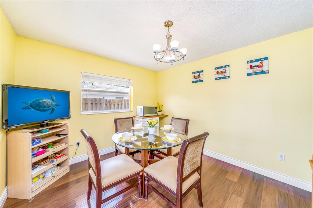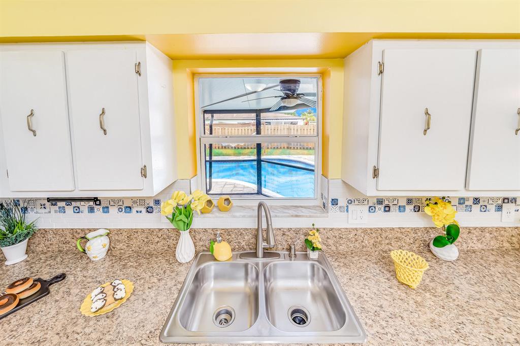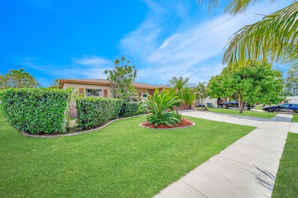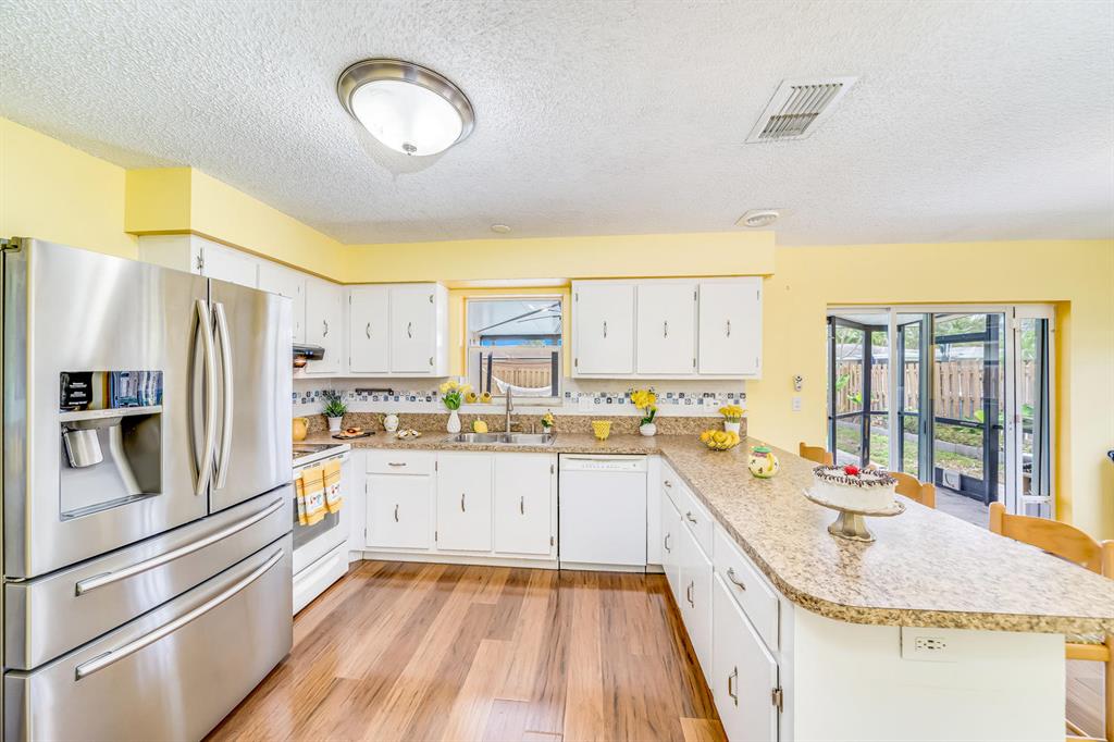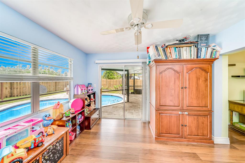 Spacious & open 3 bedroom plus a big playroom/bonus space/den (could be 4th bedroom), 2 bath, 2 car garage, huge backyard with covered & screened in patio with a huge sparkling swimming POOL! High end laminate wood flooring throughout. Newer windows/some are impact/all have shutters as well. Huge kitchen features tons of cabinets and counter space plus a sunny eat in area. A formal living room and big living room plus a large bonus room. Large bonus room makes a great family/Florida room, playroom, man cave, office, gym etc. Move in Ready! Guest bath is updated and has a large bathtub(bigger and deeper than the normal tubs). A tropical paradise awaits you outside featuring a huge fenced in yard with mature trees including mango, guava, loquat, bananas and jackfruit.