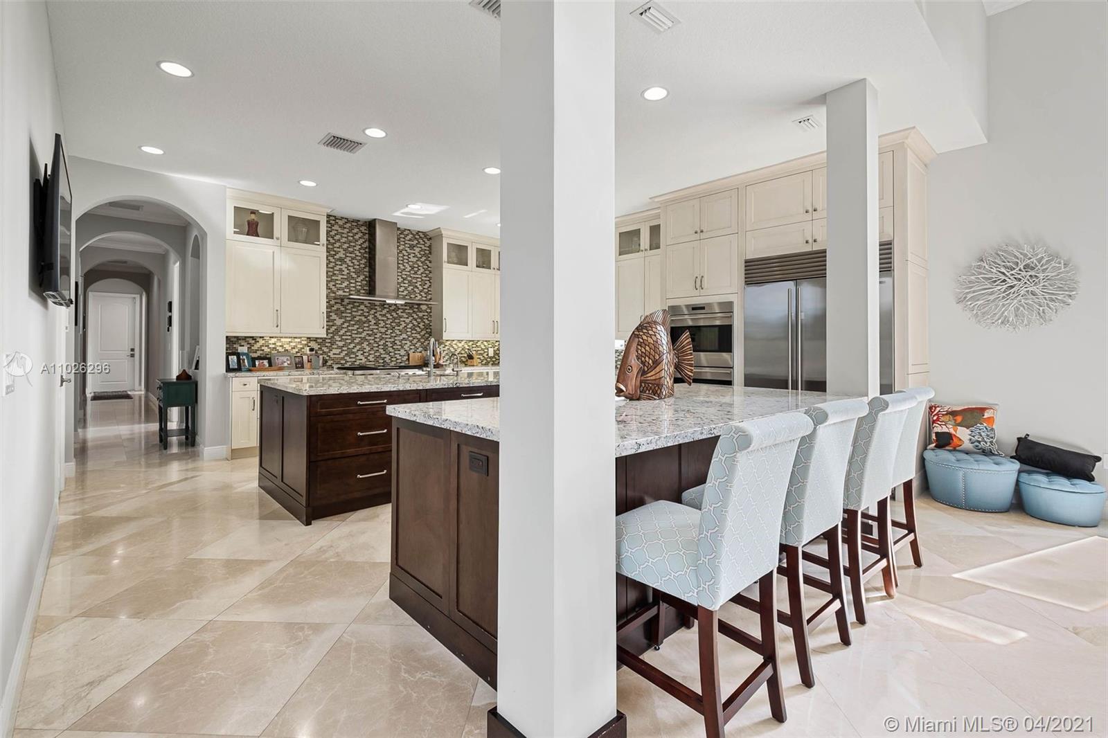 One of only 8 gated custom homes on a quiet cul de sac. You are greeted by a formal courtyard-style entry that leads to interior vaulted ceilings, crown moldings/baseboards, and wonderful open spaces. Huge chef’s kitchen w/ 2 islands, 6-burner Wolf stove w/griddle, Wolf ovens and Sub-Zero refrigerator/freezer opens up to breakfast nook and oversized family room. Second family room extension separated by dual-sided fireplace offers many uses. Formal dining room features built-ins, warming drawers, and refrigerator and freezer drawers. House has impact-rated windows/doors, generator, two buried propane tanks, full summer kitchen, 13 exterior security cameras, Nest A/C system, sprinkler system and many more upgrades. Salt-water filtration heated pool w/in-pool spa.