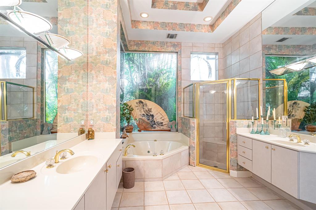 One story, 4 bedroom courtyard estate with lake view located on a private cul-de-sac street. Incredible open floor plan with kitchen opening to breakfast area and family room overlooking the tropical courtyard and pool patio area. Oversized owner's suite with sitting area is complete with huge walk-in closet and palatial bath. Large kitchen has newer stainless steel appliances and is perfect for entertaining or hanging with your family at the breakfast bar. Two en-suite guest bedrooms are very generous in size with great closet space. Sun drenched patio area with freeform pool and raised spa includes covered built-in entertainment bar. Circular drive and oversized 2 car garage complete this home. Membership to Boca Pointe is not mandatory but is available.