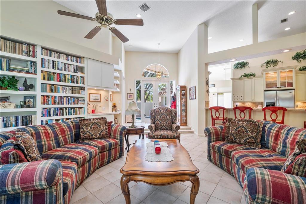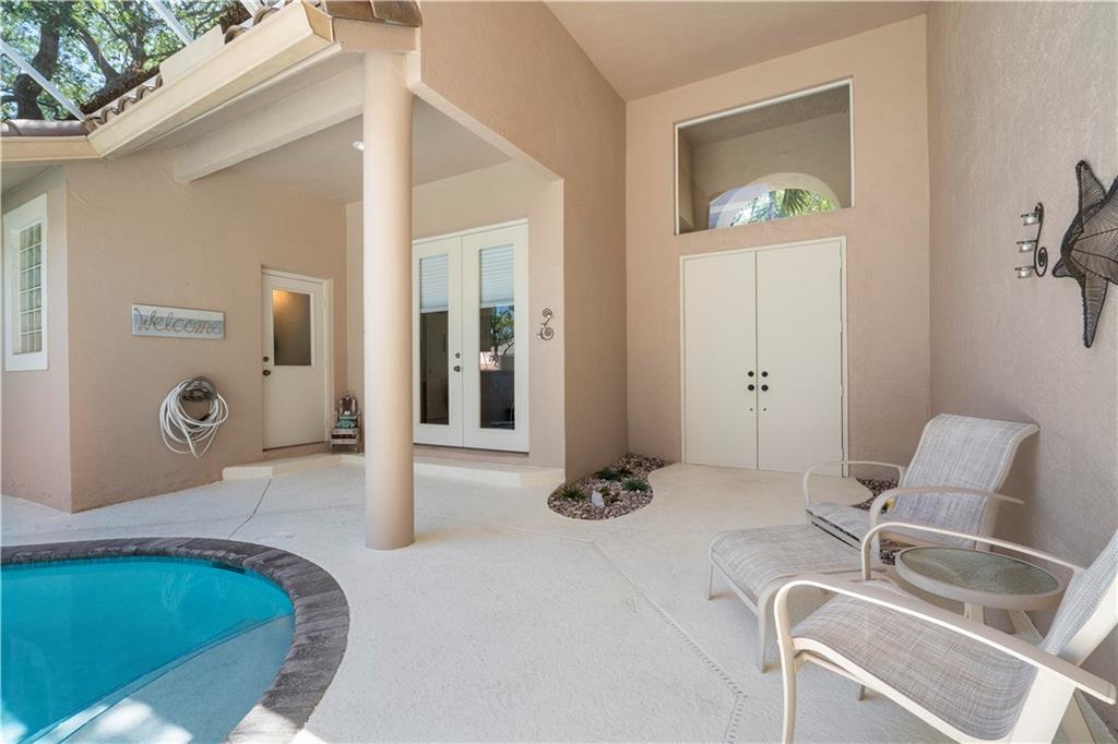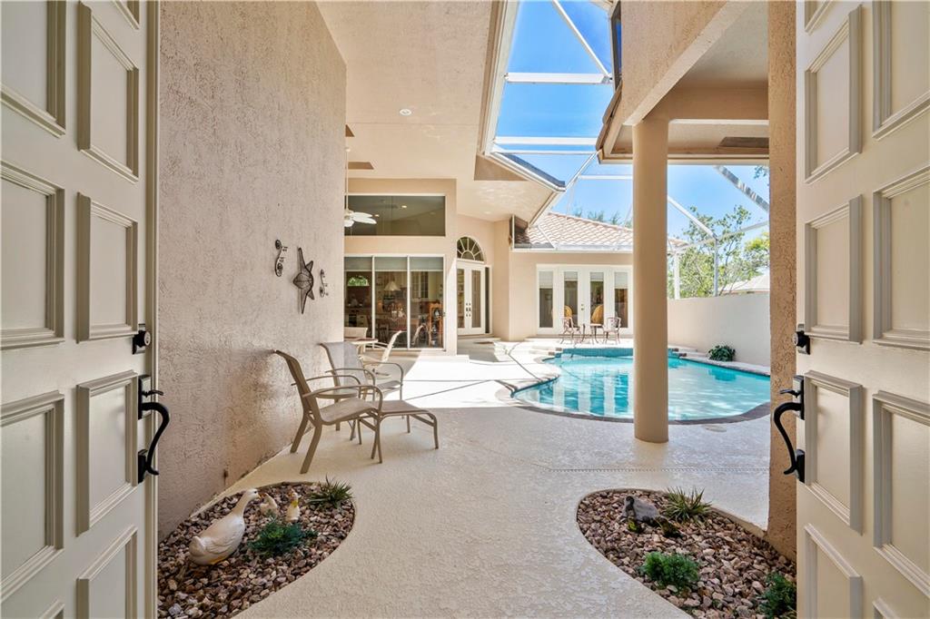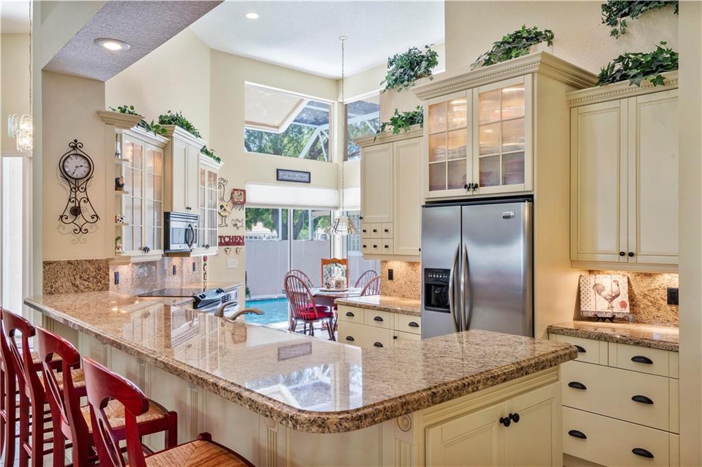 Popular Courtyard Home with separate 1 Bedroom 1 Bath Guest House. Raised foyer entry to huge great room with high volume ceilings, palladium windows and full wall built-in bookcase and bar. Remodeled gourmet kitchen features lots of cabinets space, all stainless steel Frigidaire appliances including double convection wall ovens, granite countertops and backsplash, snack bar and big walk-in pantry. Big breakfast room with views of pool/patio. Master suite with updated bath. Large secondary bedrooms with laminate and "wood look" ceramic tile flooring. Lots of fans, closets, high hat lighting and transom windows throughout. Domed, screened pool re-marcited in 2012 with large covered area & built-in bar, great for entertaining. Three car garage and stamped concrete driveway.