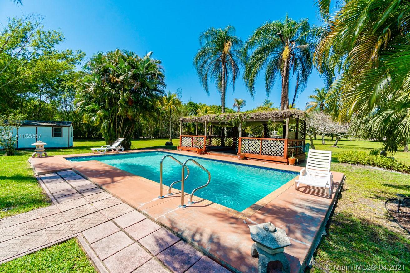 Private gates lead you into this impressive estate situated in Country Club Ranches. Original owner, custom-built ABOVE BASE FLOOD ELEVATION. with a circular driveway nestled on 2.5 acres, the main home with 3865 sq. ft. features volume ceilings, skylights, solar panels, wood-burning fireplace, showcasing 4 bedrooms, 3 full baths, one of the bathrooms is a full cabana bath, plus two additional bonus rooms home office-library-den. Spacious backyard made for entertainment includes tropical fruit trees, Master bedroom with stunning views from the 2nd story deck of the grounds, pool, and gazebo. Gives you the feeling of country living with city convenience only 5 minutes from I-75, 20 minutes from Fort Lauderdale, and 30 minutes from Miami. No HOA fees.