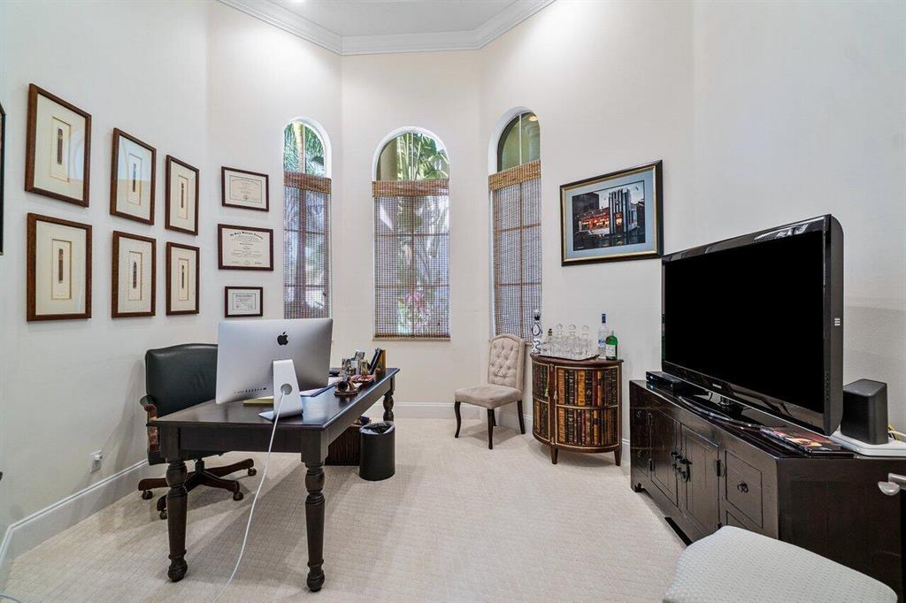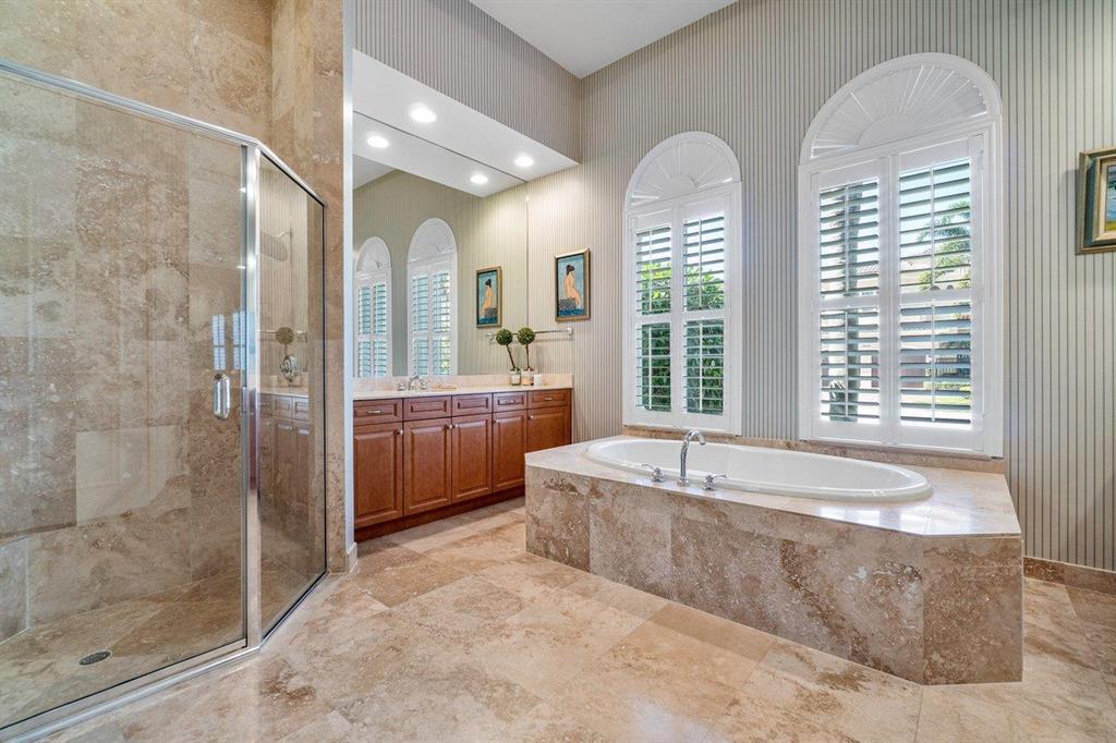 This custom Burgundy model boasts over 4,800 living square feet including 5 bedrooms, 5 full and two half baths including cabana bath and powder room, an office, loft, and a gorgeous south facing lakefront lot. This move in ready home welcomes you with its soaring ceilings, an open floor plan, sun drenched rooms, white gourmet chef's kitchen with granite countertops and opens to a spacious family room overlooking the expansive backyard with pool, spa and summer kitchen perfect for year round enjoyment and entertaining. Timeless millwork, tray ceilings, plantation shutters and marble flooring on the main floor add to the elegance of this home. An expansive private master suite located on the main level with his & her closets