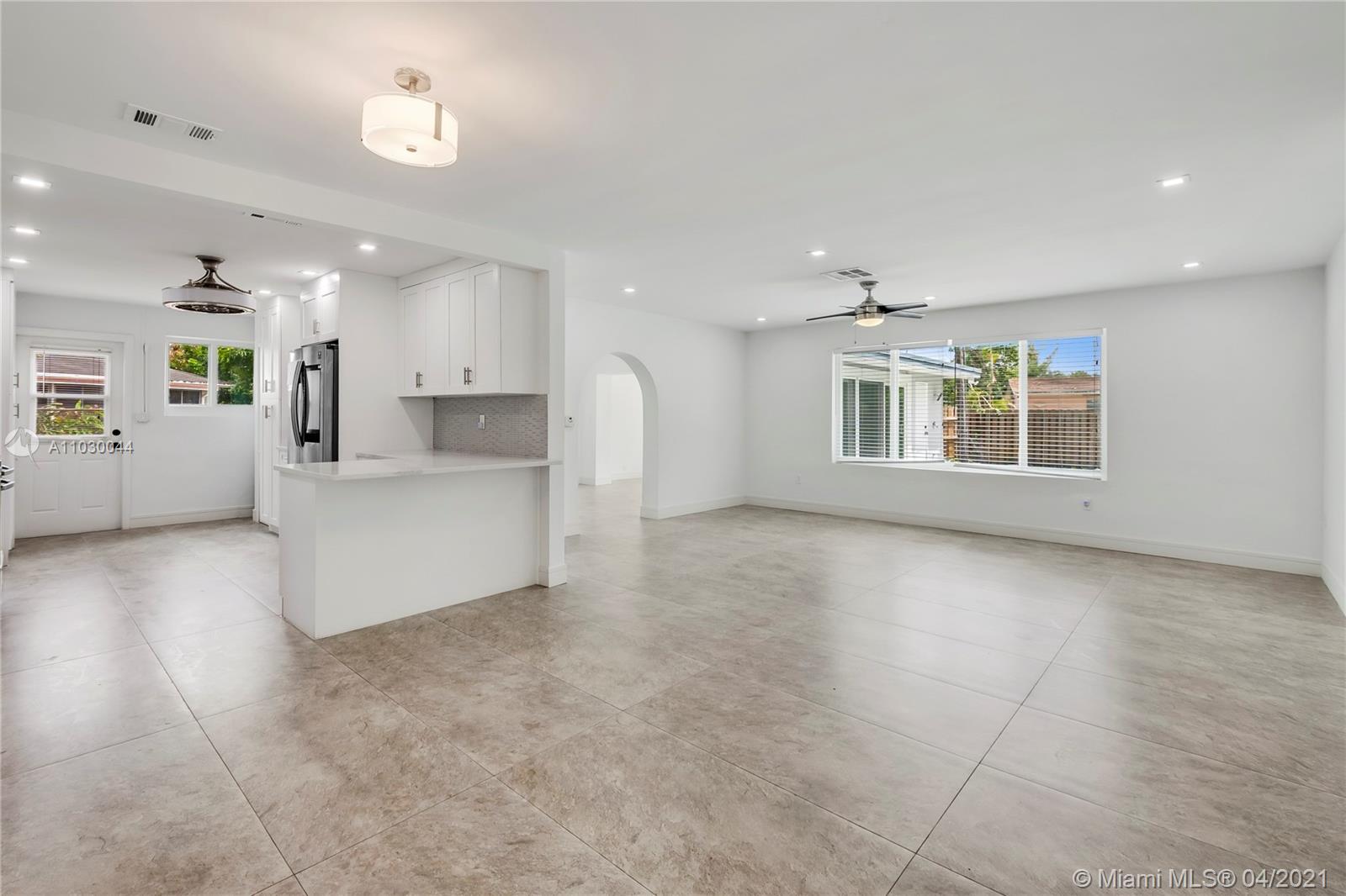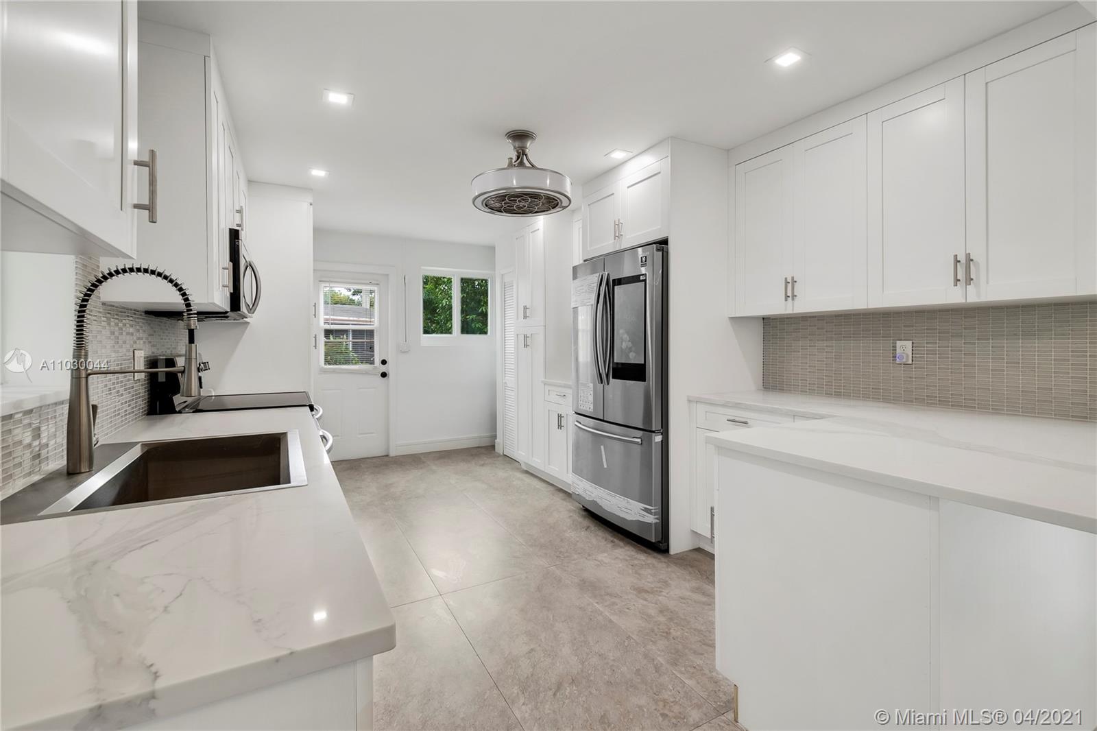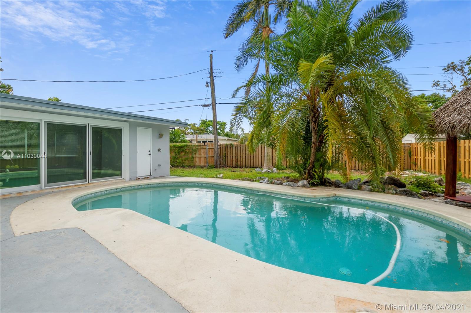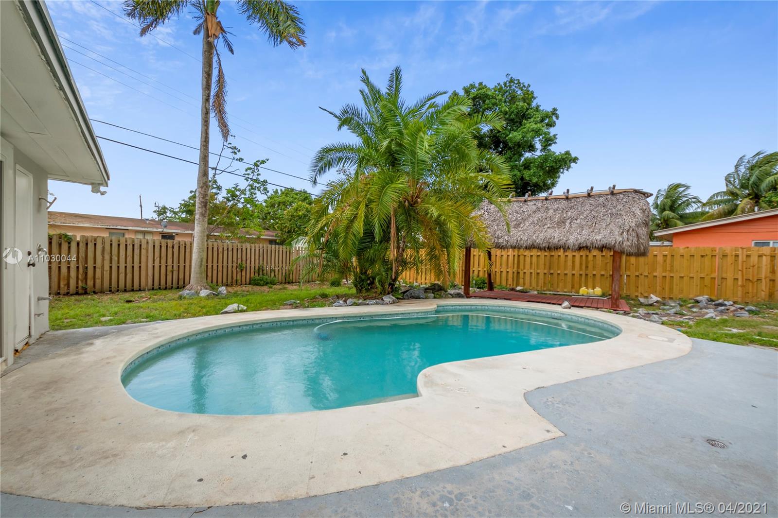 Contemporary 3/2.5 pool home! This home has been tastefully remodeled w/no expense spared. Newer roof, Hurricane impact doors & windows. Freshly painted inside & outside. recess lights throughout the home. New floors 24x48 inch rectangle porcelain tiles in all living areas. New kitchen with high end cabinets, granite counters, matching back splash new appliances. Smart refrigerator, washer & dryer*** New bathrooms offering modern high end tiles fixtures & vanities, w/blue tooth stereo speakers, perfect for long showers. Back yard oasis with a large pool & cabana bath, & a tikki hut prefect to entertain! Fantastic curb appeal. True move in ready must see!