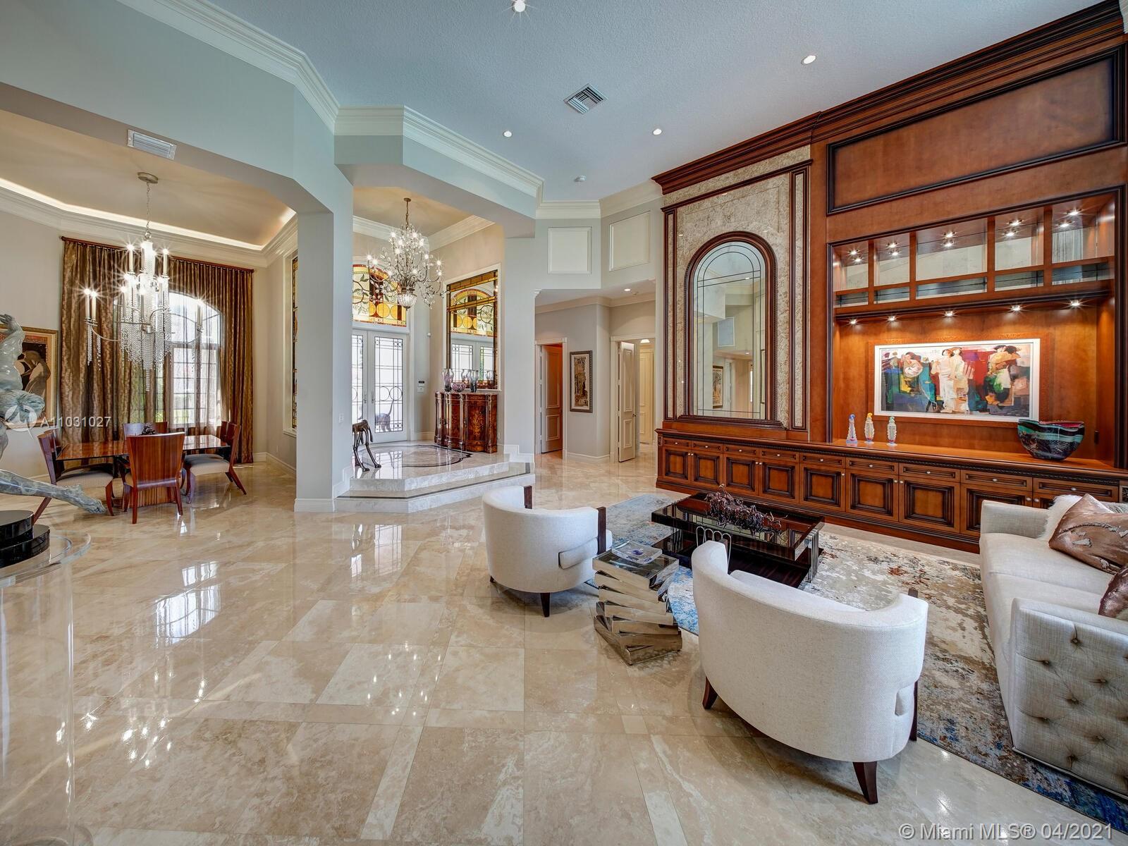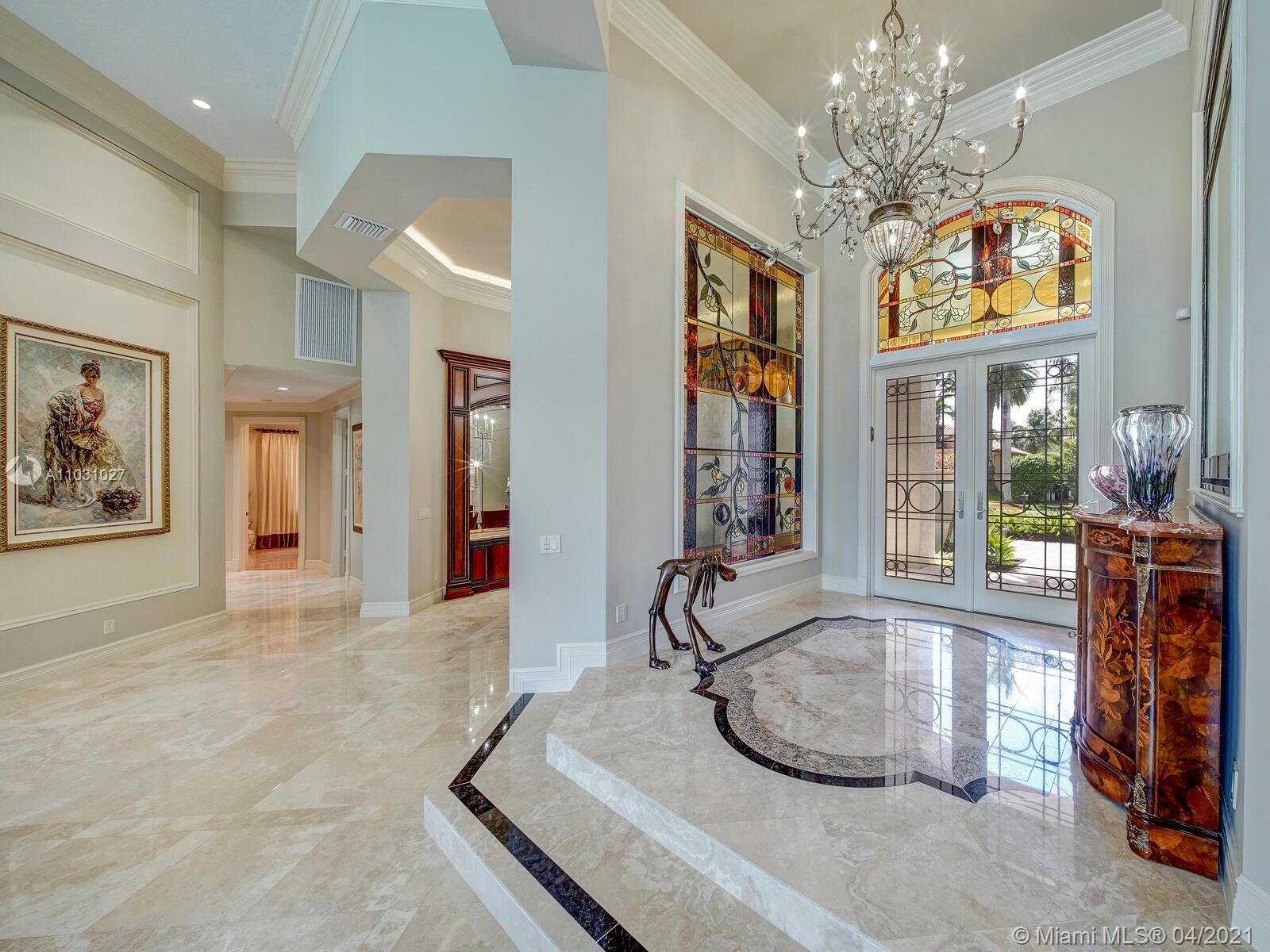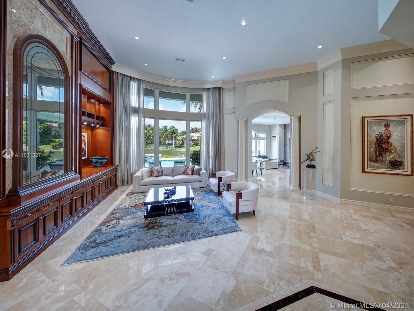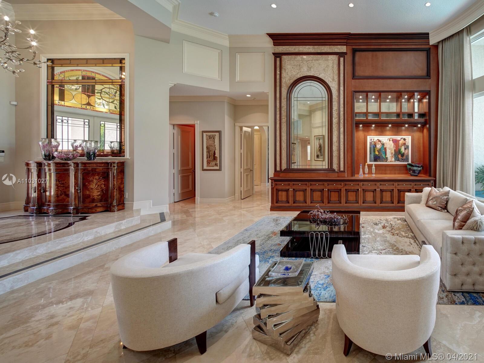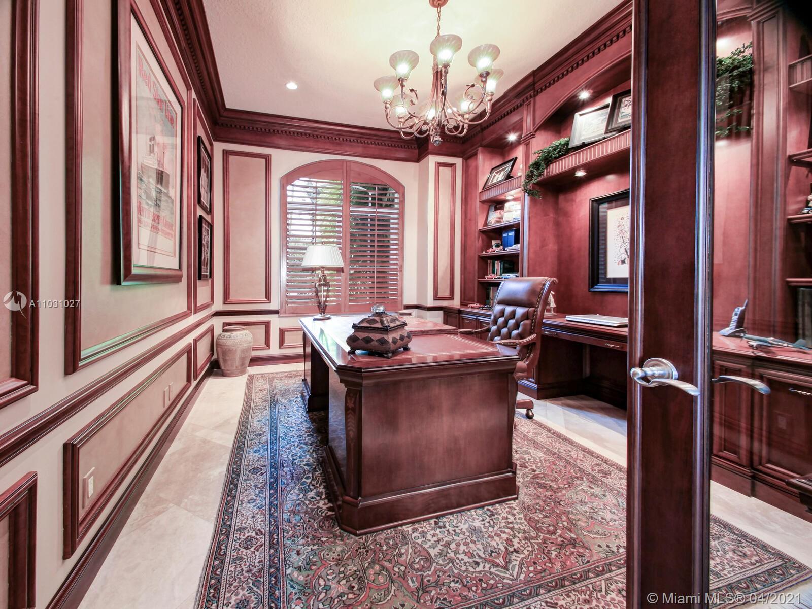 Discover a new kind of luxury brought together by the best of design. Beautiful 4 bds, 3.5 bth + office and 3 CG. Full impact glass. Remodeled kitchen w/ double stacked Italian olive wood cabinetry ,new quartzite counters, island and new appliances. High volume ceilings 16', real wood burning fireplace. The main suite features a completely separate lounge with huge double closets and built-in + a marble spa bath. Custom built ins are featured in the dining room, living room and complete custom library. Marble floors in the main areas, master bedroom and office. Wood flooring in all other bedrooms. Gorgeous recently new diamond bright heated pool and spa. Large covered lanai w/ built in summer kitchen. All designed lighting fixtures by Fine Arts. This is a special custom home.