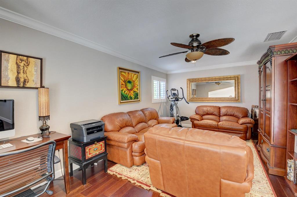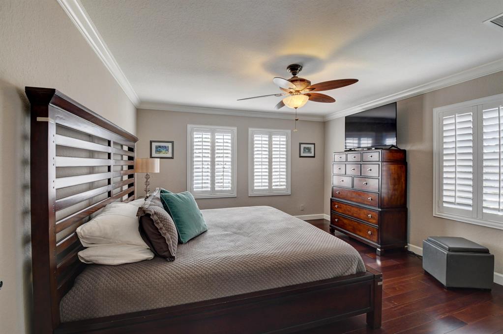 Elegant & natural sunlight-filled 2-story courtyard home of 3 bedrooms plus a loft & 21/2 baths features high-volume ceilings with crown moldings; polished Crema Marfil marble floors;gourmet island kitchen of transitional flair-white 42'' cabinetry with pantry roll-outs & self-closing drawers, granite counters & backsplash, stainless steel appliances, double oven & brand new dishwasher; newer washer & dryer. Exotic Brazilian hardwood floors accent the Master suite, staircase & the entire second floor except in the recently remodeled full bath.The Master suite has 2 spacious walk-in closets & a white marble bath. Features also include custom window treatments & plantation shutters, LED lighting throughout. Fabulous,private outdoor space featuring a freeform pool with waterfall,grassy area