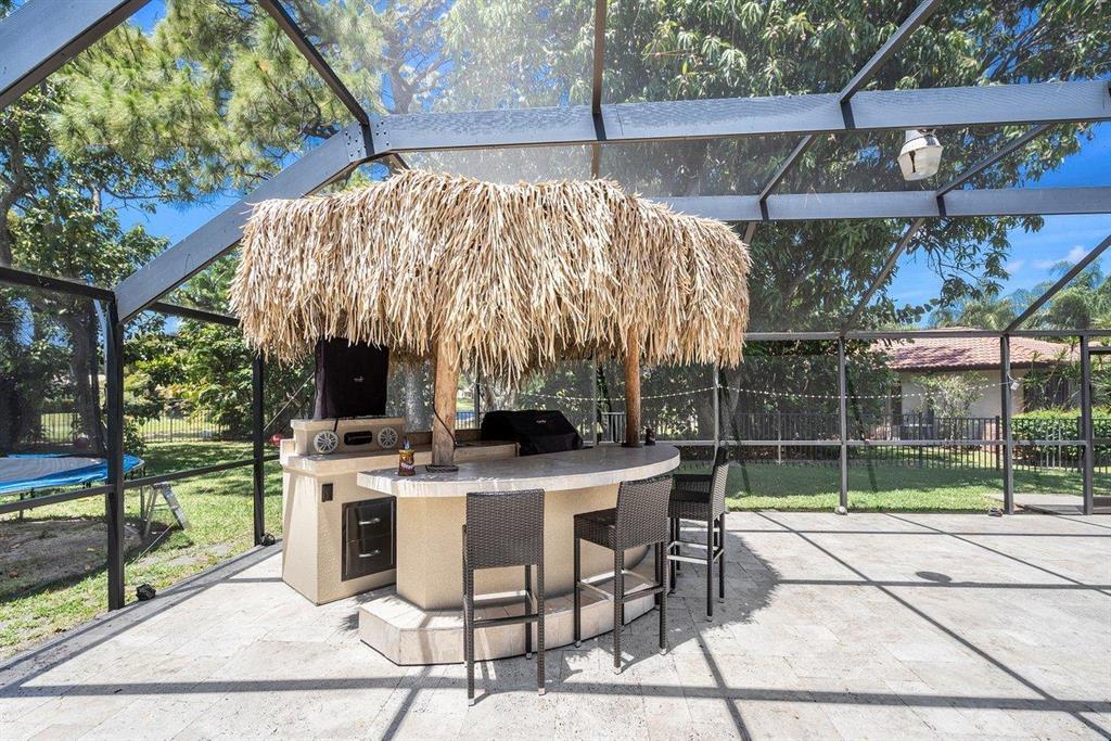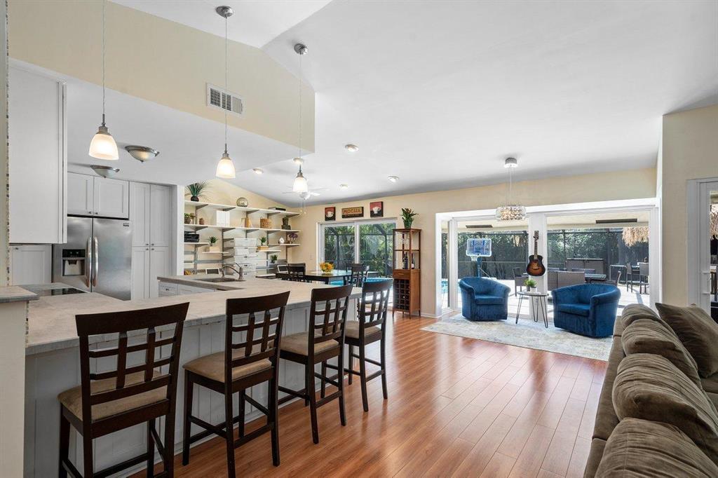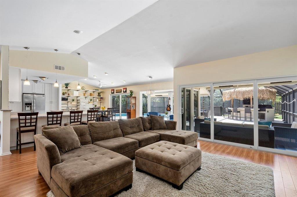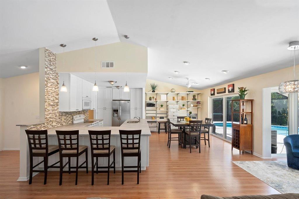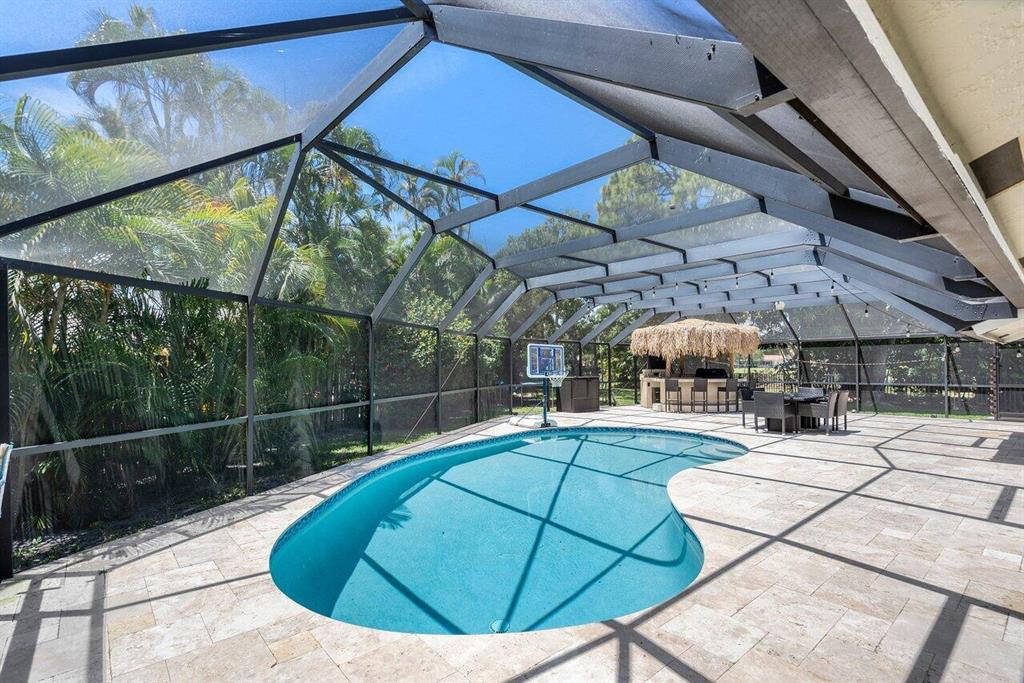 Fantastic remodeled home in Timbercreek! Rarely available, open floor plan with Vaulted Ceilings, extremely light, bright, open and airy. Abundant features throughout including 3 bedrooms, 2 bathrooms, all HURRICANE Impact Windows and Sliders, smooth ceilings throughout, both Bathrooms remodeled, huge screened pool and patio area with a $30k Tiki hut includes refrigerator, TV, and bbq grill, Tiki Hut has underground electric and water drain line. HURRICANE rated garage door (2018), garage has a split AC unit adding over 400 sg ft of under air space, S-tile roof (2002), HVAC (2010), Tankless hot water heater (2018), huge 12,812sf lot, pool and patio recently resurfaced, newer salt water pool filter system, newer sprinkler system, large storage shed, 2 large side yards have plenty of room