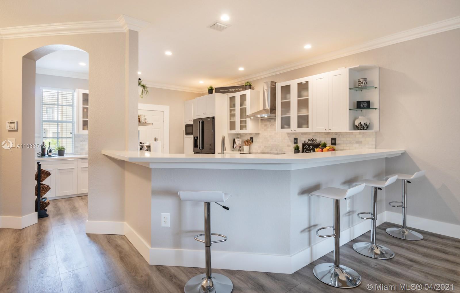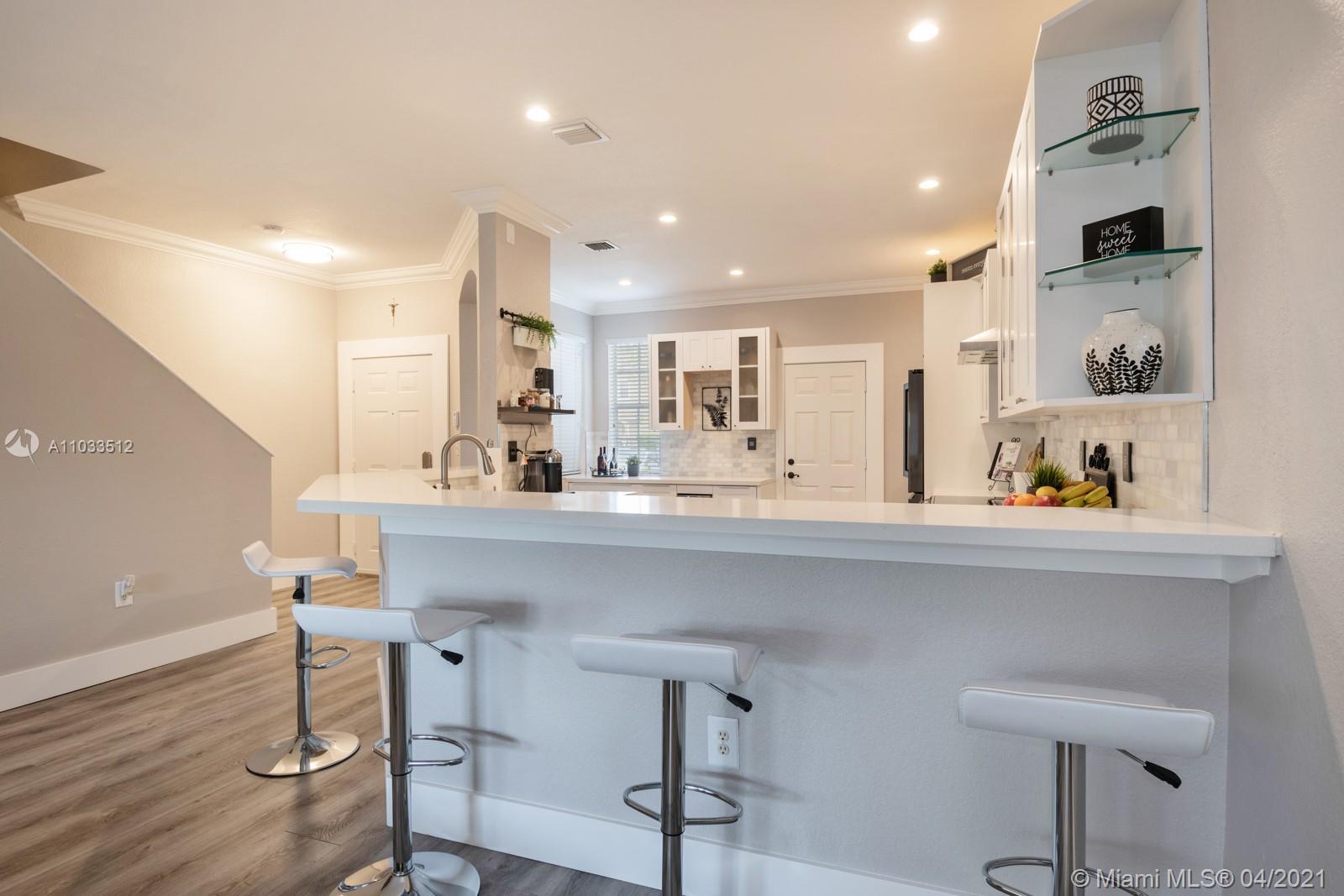 Tastefully & thoughtfully remodeled townhome 'with a garage' that feels like a single family home! Light, Bright, Oversized, Open Kitchen is the center of the home! Gorgeous white quartz kitchen counters, shaker-style white wood cabinets & oversized drawers complimented with marble tile backsplash throughout the kitchen. Samsung black SS appliances & hood, plus wine refrigerator. 3 bedrooms, 2 1/2 bathrooms, plenty of room for everyone upstairs plus a bonus loft/nook at the landing. Wood look tile floors throughout & on stairs, new carpet in bedrooms. Beautiful custom main bedroom closet! Screened-in patio area with access to common area grass - perfect for pets. 24-hour guard-manned community. Amenities include tennis, fitness center, pool, parks, clubhouse, to name a few. Move-In ready!
