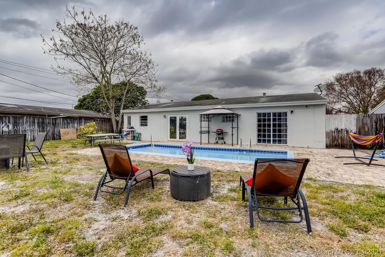 Lovely 4 bd / 2 ba home with a spacious pool backyard, chef’s kitchen, and open layout! There is a bonus room with a closet that could serve as a 4th bedroom. A curved paver driveway leads to the front of the home, where you’re met with an inviting porch - the perfect spot to enjoy your morning cup of coffee. Upon entrance, notice the bright and airy interior, complete with tile flooring and crown molding. Watch TV in the living room, and enjoy a meal with guests in the dining room that overlooks the pool through French doors. To the side, cook in the gorgeous kitchen, equipped with granite countertops, stainless steel appliances, wood cabinetry, bar seating, and a convenient laundry area. Wind down in the primary suite, which has sliding glass doors to the backyard, and a mirrored closet.
