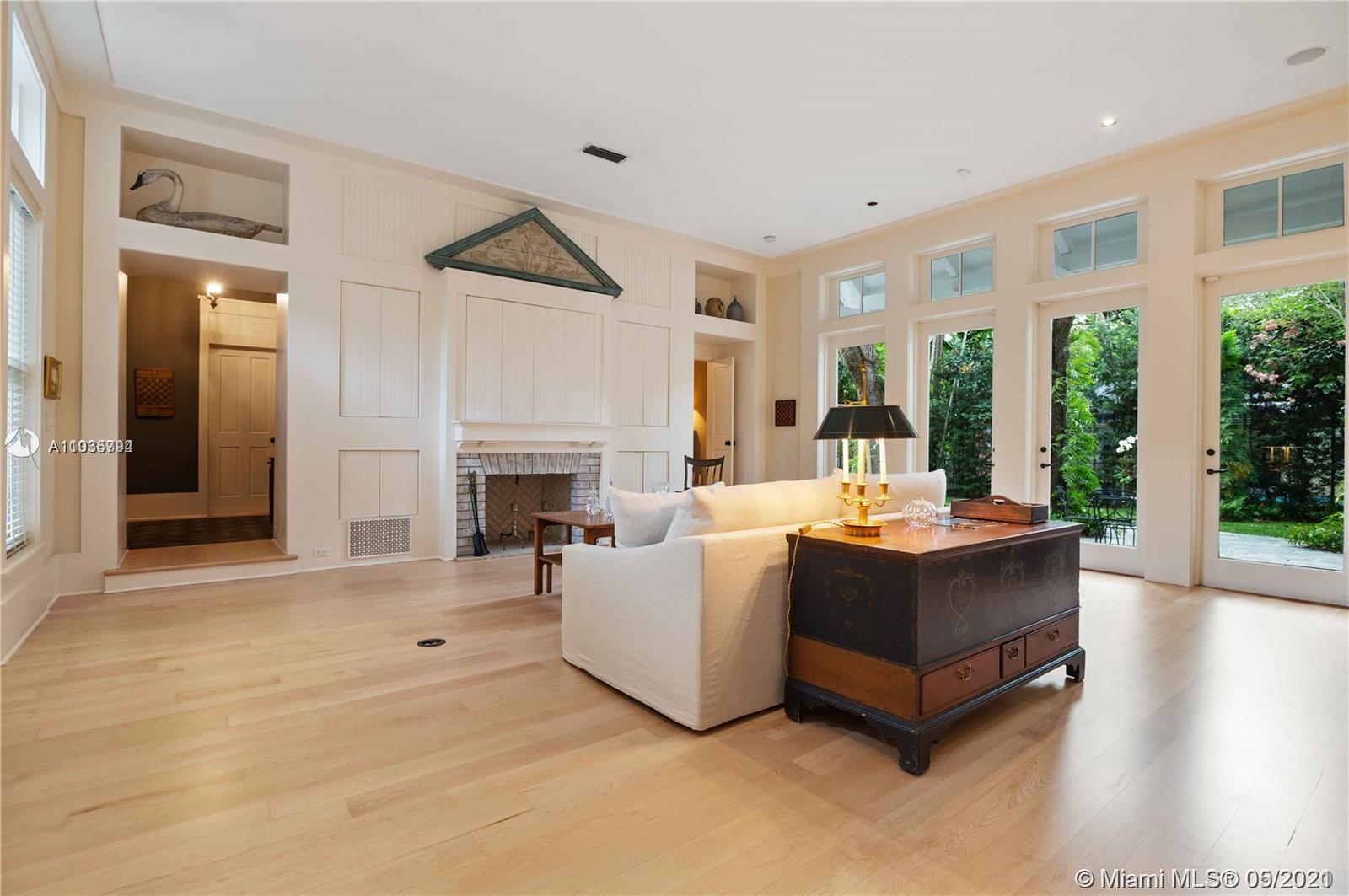 An architectural masterpiece adjacent to Coral Gables' "Pioneer Village". The open "Great" room invites you in w/ 13-foot ceilings in a bright cheerful space. A diagonal composition of the plan guides movement throughout the house. Interior details include two brick fireplaces, custom light-fixtures, mouldings, & maple-wood flooring throughout. Kitchen features cabinetry w/ hand-blown glass, soapstone counter-tops, & Viking/Sub-Zero appliances. 3-BR on the second level feature en-suite bathrooms w/ Waterworks fixtures & tilework. Downstairs room may serve as an office/study or guest room. The interiors communicate freely w/ the enchanting outdoor space. A series of french doors open out to a slate patio & turfed garden. Located steps away from the prestigious Riviera Country Club.
