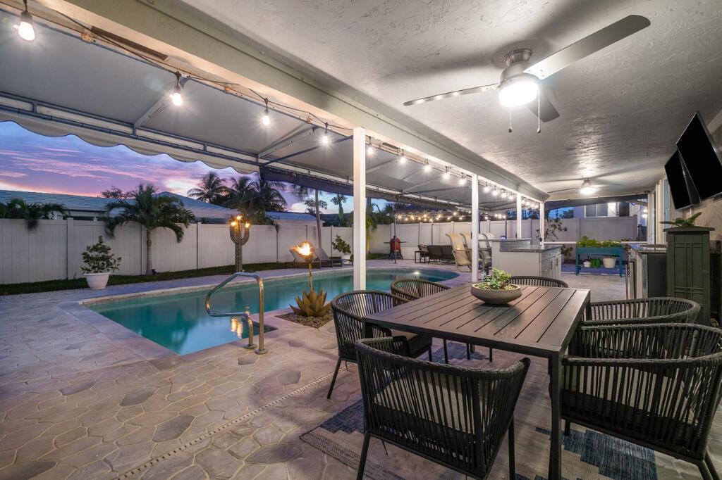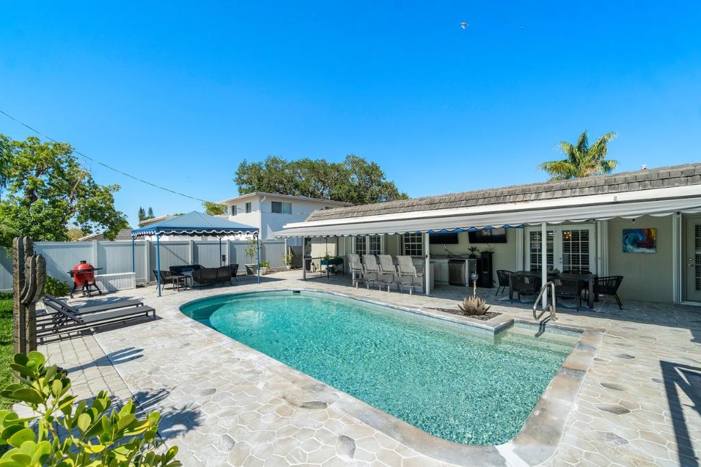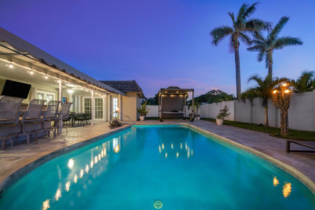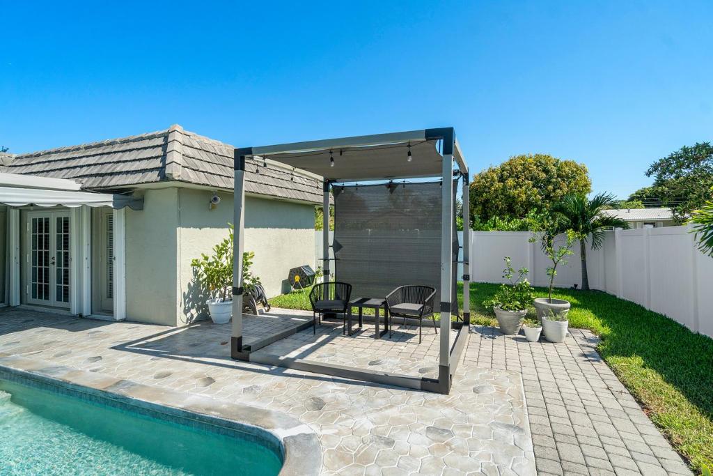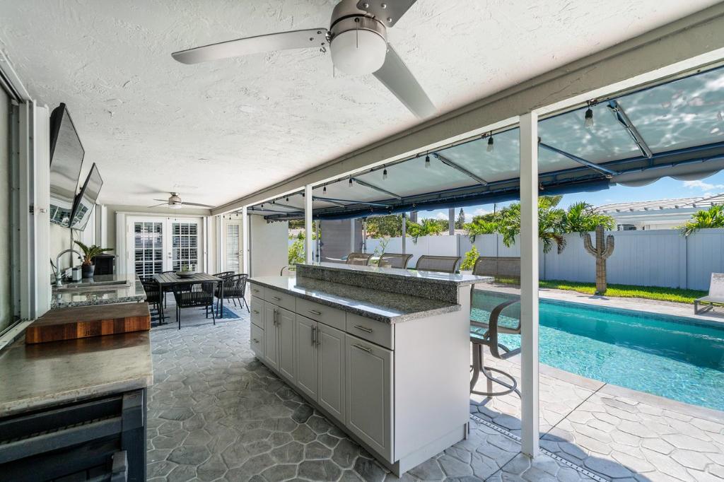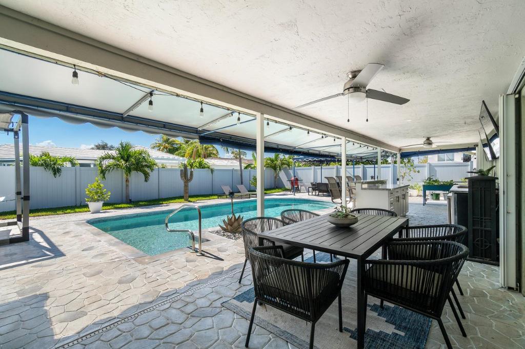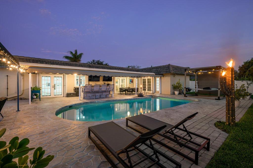 This gorgeous East Boca single family home was completely renovated in 2020 and is a must see! This single-story house welcomes you with an incredible open-floor plan, renovated kitchen with beautiful white quartz countertops and backsplash, soft close cabinets, and new coffee bar with built-in pantry. Wake up to the view of the pool in the master bedroom, and enjoy the luxury of 2 cabana bathrooms for convenient access outdoors. The large bedrooms feature walk-in closets. The backyard is a privately secluded paradise that is built for entertaining and relaxing with a heated salt water pool, multiple covered spaces, TVs, bar and grill area, cabana with option for a hammock, and firepit.