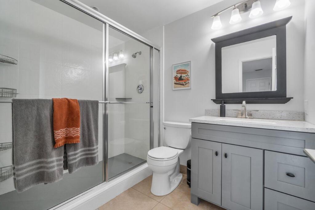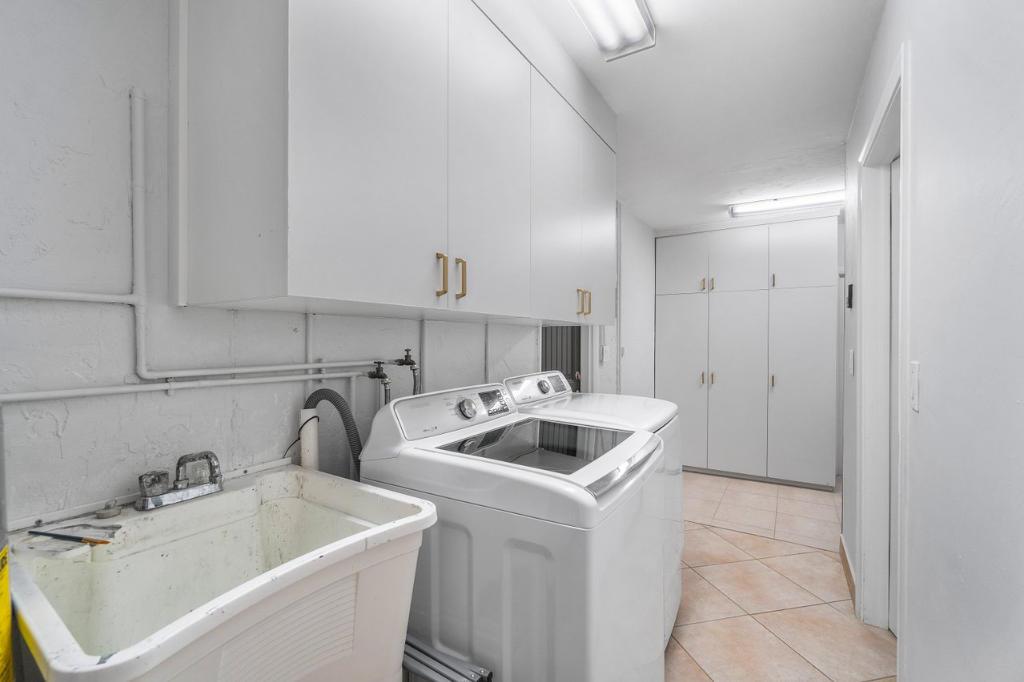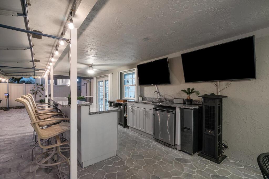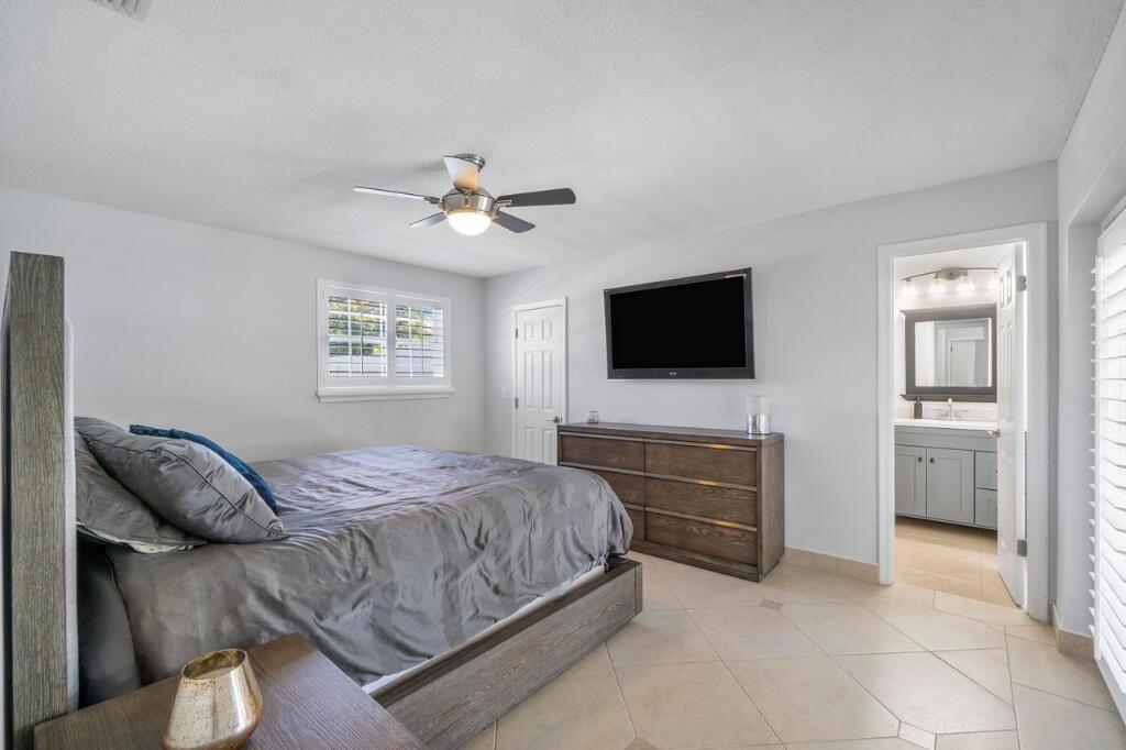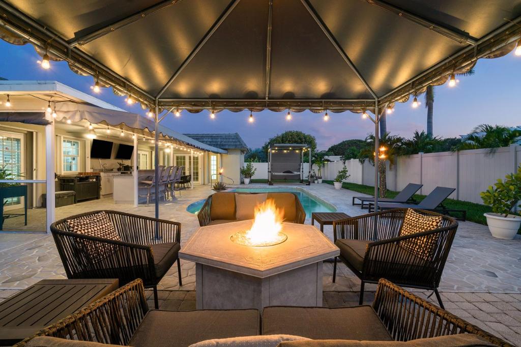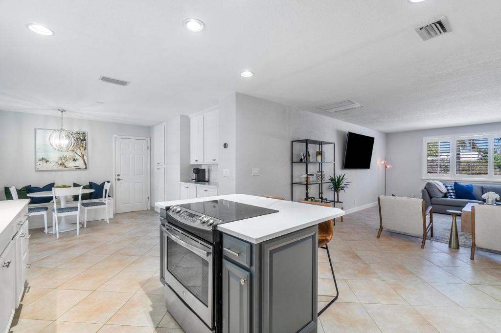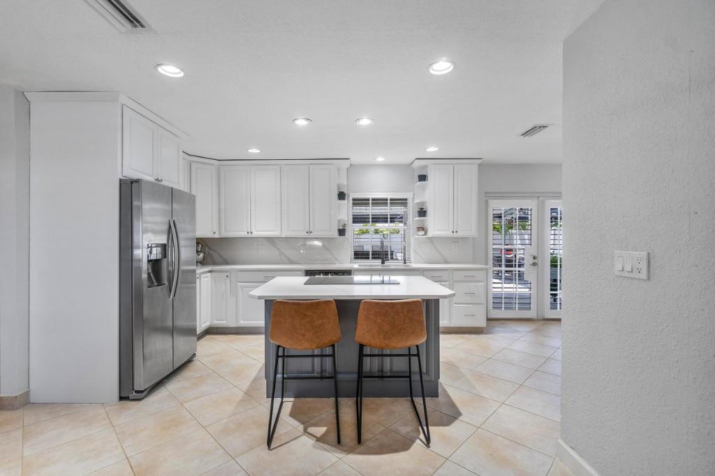 This gorgeous East Boca single family home was completely renovated in 2020 and is a must see! This single-story house welcomes you with an incredible open-floor plan, renovated kitchen with beautiful white quartz countertops and backsplash, soft close cabinets, and new coffee bar with built-in pantry. Wake up to the view of the pool in the master bedroom, and enjoy the luxury of 2 cabana bathrooms for convenient access outdoors. The large bedrooms feature walk-in closets. The backyard is a privately secluded paradise that is built for entertaining and relaxing with a heated salt water pool, multiple covered spaces, TVs, bar and grill area, cabana with option for a hammock, and firepit.