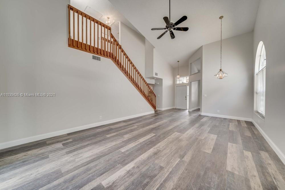 Fall in love with this charming home that is sure to wow you! Step into this home to immediately notice the high ceilings & beautiful wood-like floors. Left of the foyer, a den serves as an office or dining area to suit your needs. The living room is bathed in light coming in through the windows & screened patio with an added jacuzzi for you & your guests to enjoy! The primary bedroom is conveniently located downstairs & offers a walk-in closet & private bathroom. It is also located next to the laundry, guest restroom & eat-in kitchen. Upstairs you will find your 2 bedrooms divided by a shared bathroom. Located in Jacaranda Pointe, this home is close to parks, shops, highways & much more, come take a look today and make it yours!