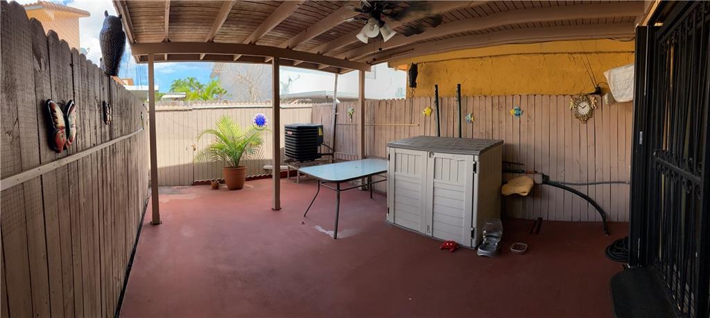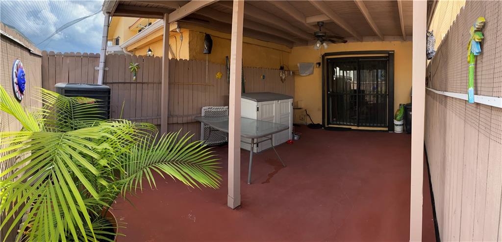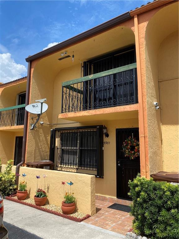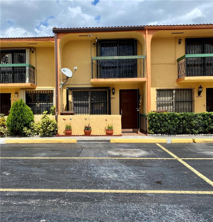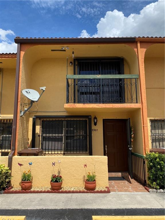 Charming Townhouse in the heart of Hialeah. Appealing Community with 56 units in El Sevillano Townhomes Condominium Community. Well kept, pleasing and alluring home. Enjoyable kitchen, beautiful ceramic floors downstairs, and wood laminate upstairs. Living area downstairs with half bath and two bedrooms and one full bathroom upstairs. Amazing terrace/patio for entertaining and spending quality time with family under roof and fenced for privacy. Security Cameras, security bars. Shutters and gutters. A must see, In move-in condition!
