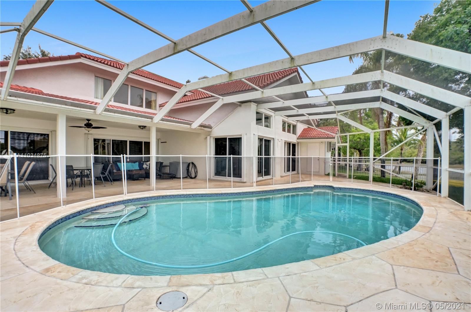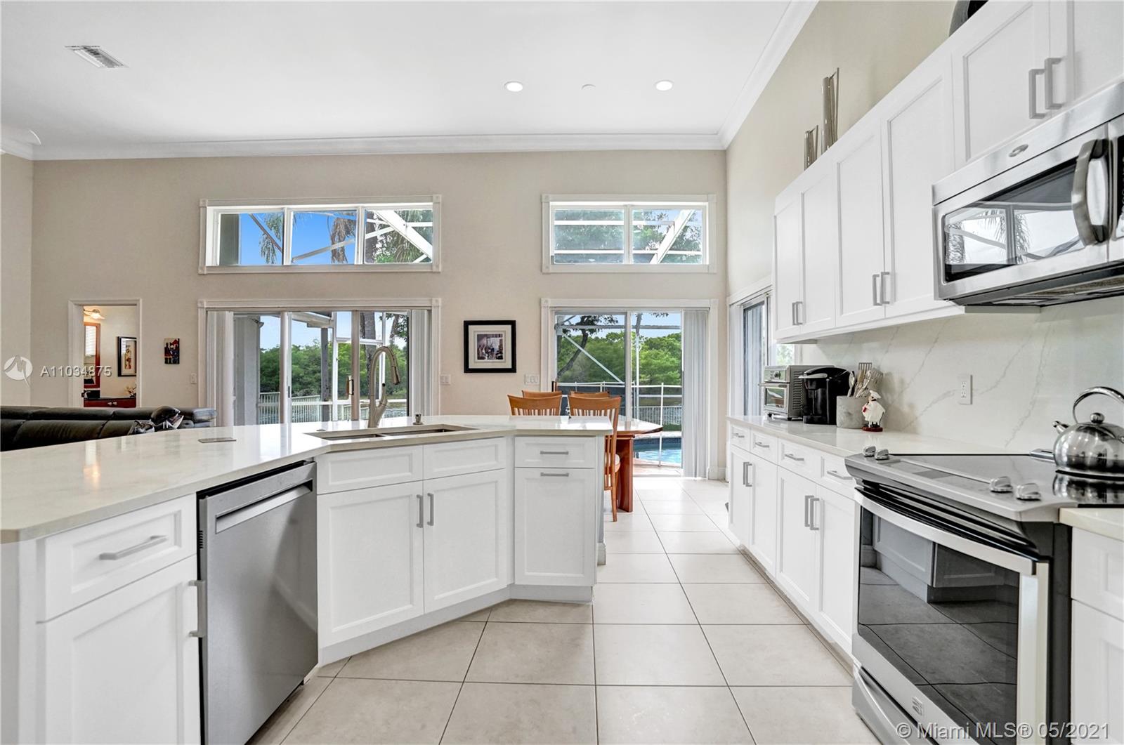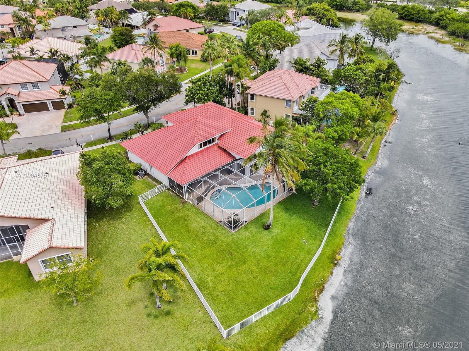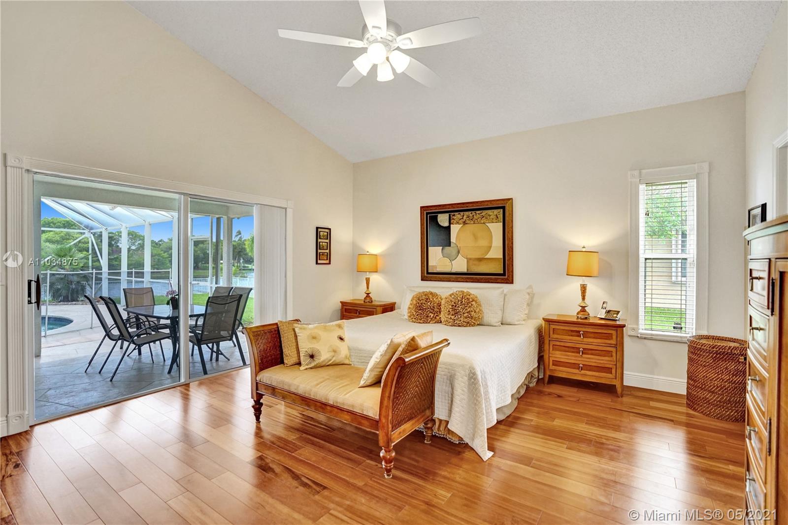 This spacious pool home sits on a premium oversized lot, boasting 133 feet of endless views & waterfront enjoyment. Unique architecture featuring a bright interior & dramatic 18 ft ceilings. This smart floor plan offers a ground level master suite, updated bath with marble finishes, whirlpool tub & separate stall shower w/glass enclosure. Cooking & entertaining is a pleasure in the BRAND NEW KITCHEN, featuring a generous center island & quartz counters w/waterfall design. Enjoy the outdoors in your covered patio, a fully screened pool & totally fenced yard with lake access for light boating in the largest lake in the area. Bonus features: Plantation shutters, Impact windows & accordion shutter protection, 2 zone A/C cooling. Ideal location, gated access, walking distance to park & pool!