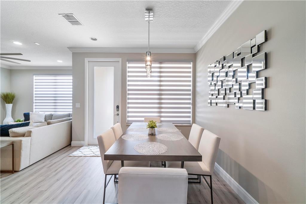 Like NEW!!!This gorgeous model perfect townhome features 3 bedroom & 2 1/2 baths- Mango model includes upgrades galore- kitchen has Calcutta Quartz countertops & glass tile backsplash- pull outs in pantry- new stainless Samsung appliances- Flooring is new modern light waterproof laminate- Crown moldings throughout- New designer lighting fixtures- Hunter Doulas Bandage shades- New washer/dryer- New fans-Closet cabinetry in Master - Freshly painted- New Trane A/C unit- Hurricane impact windows, doors & garage door - Custom stone wall in main living area- Safe in wall stays- Epoxy garage flooring- Custom furnishings are negotiable! Call to schedule a time. Community is gated with a community pool, playground & clubhouse.