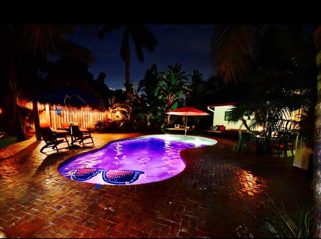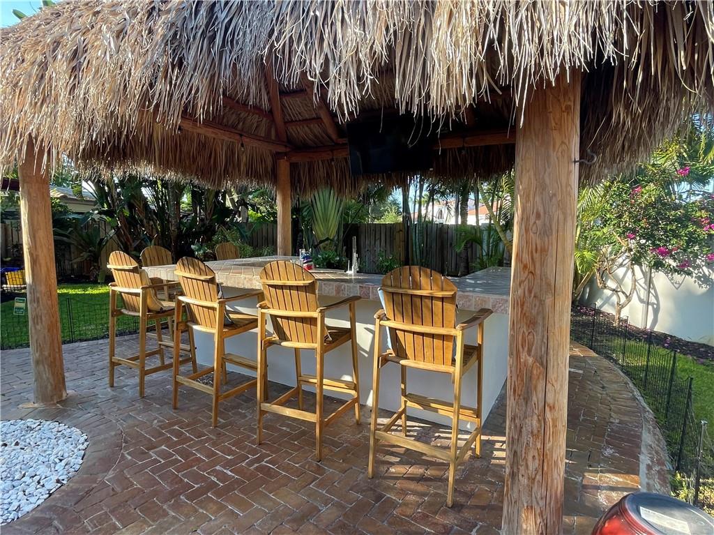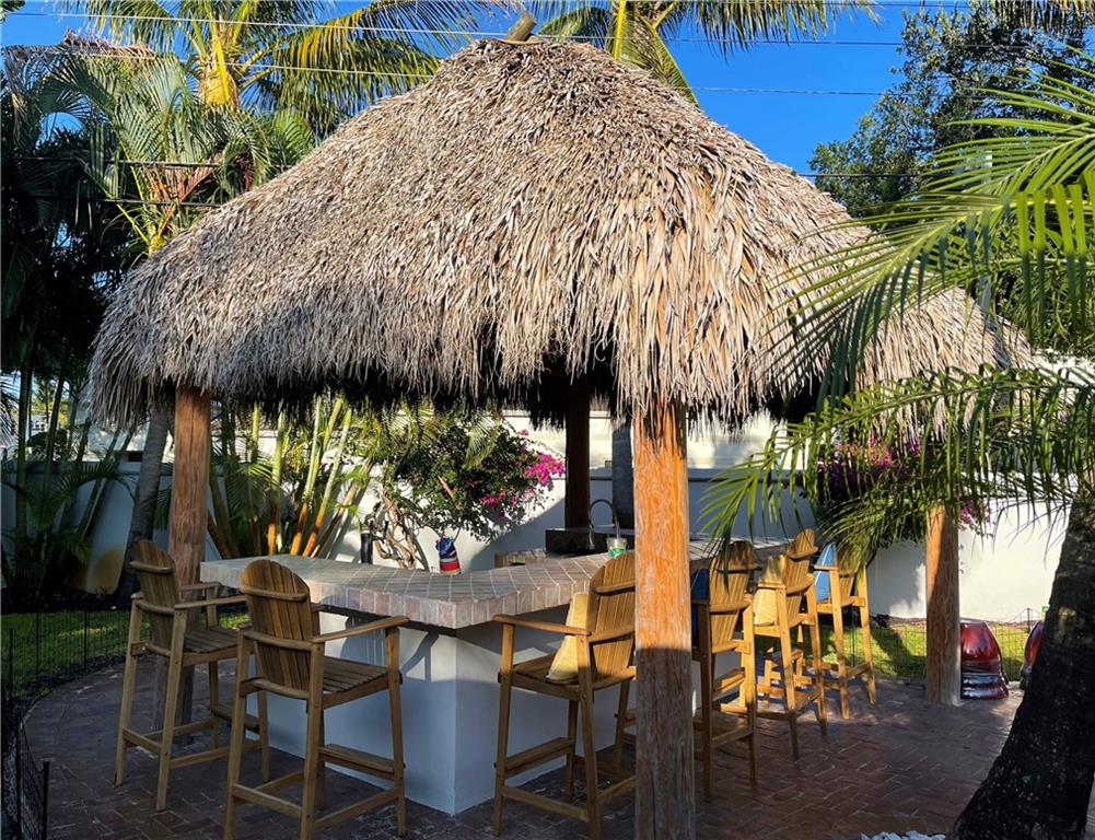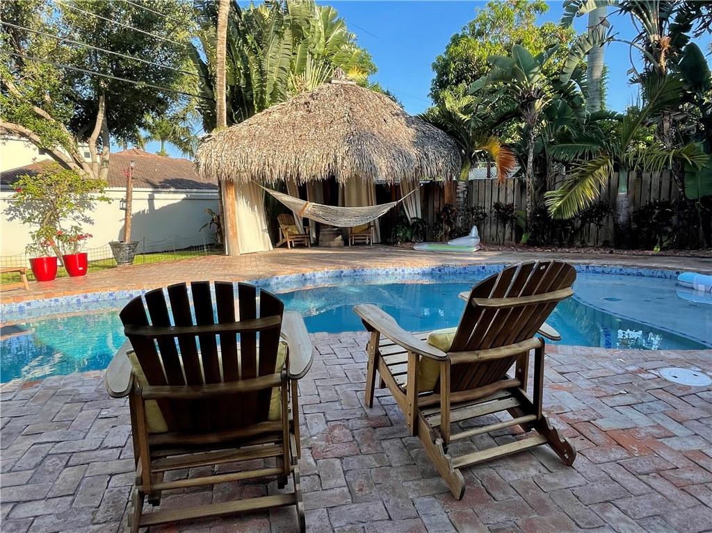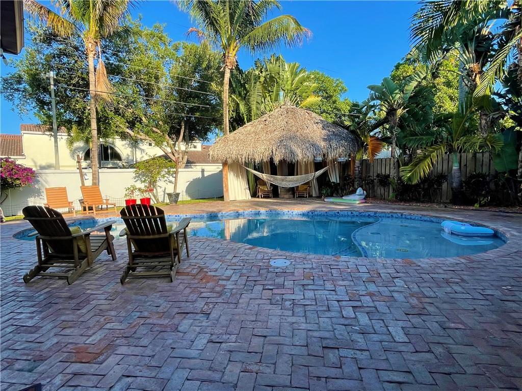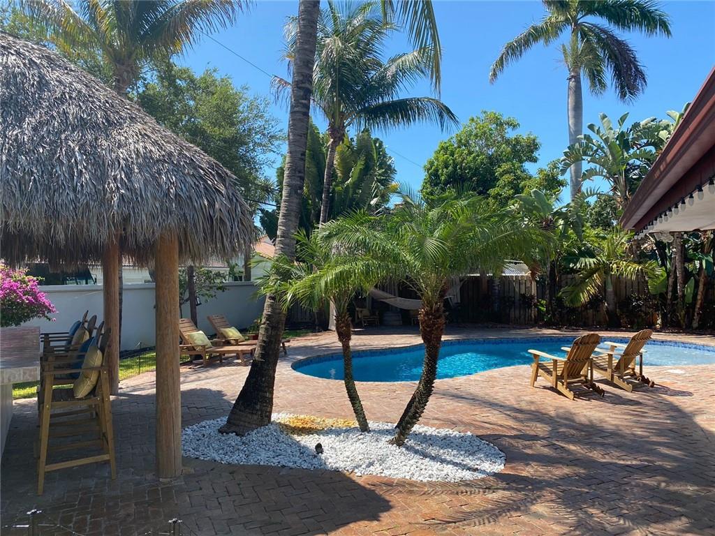 3 Bedroom 2 Bath pool in east Boca, 1 mile to the beach. Backyard is a tropical Paradise with 2 custom tiki huts, saltwater heated pool with a sun shelf. Inside you will find a nice open split layout with a large custom kitchen with granite, wine fridge, wood, and Limestone Marble floors throughout, tankless hot water system, large size laundry/utility room, plantation shutters, outdoor bar/kitchen counter with kegerator. Impact windows and doors. Brand new washer and dryer, refrigerator and pool heater. The driveway has plenty of parking. The home is located close to Mizner Park and a short ride to Delray Beach. Come see this one today before is gone.