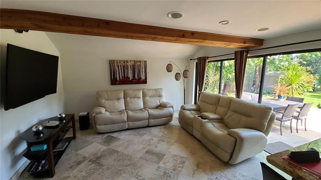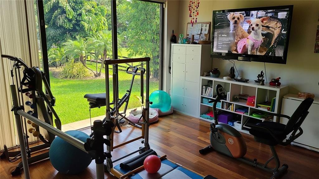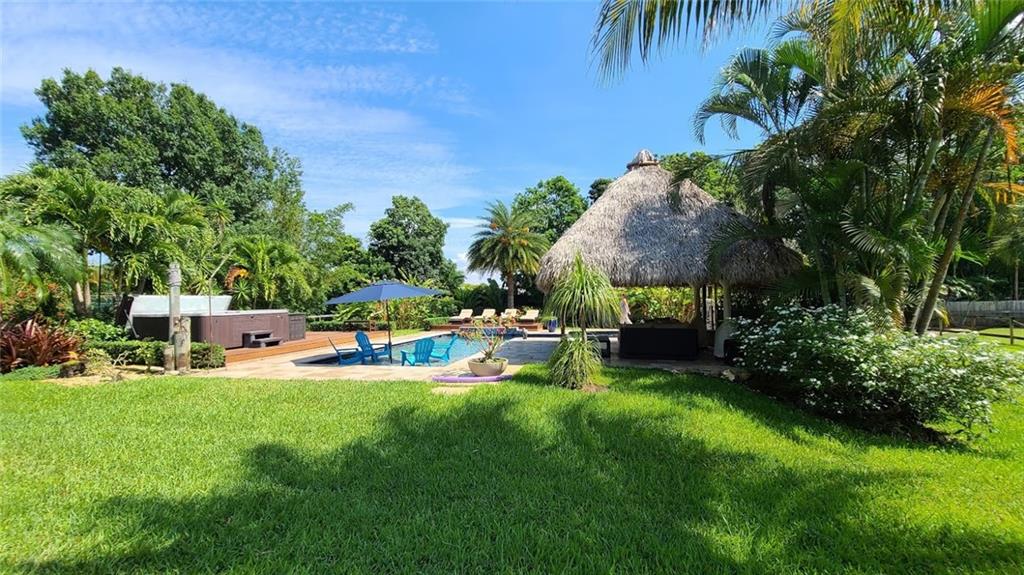 Relaxing and a tropical paradise describes this amazing home in the heart of Plantation Acres. Close to American Heritage School, Sawgrass Mills, and majors highways. This 4BR/3BA home with a double-sided fireplace exudes pride of ownership. A fantastic floor plan features an open kitchen with top-notch s/s appliances. Snack bar seating overlooking deep lush acre. The split-plan offers privacy and a bright family room. Spacious bedrooms are perfect for a growing family. Master has an additional fireplace, balcony, and panic room. Outside is equally as impressive. The backyard is fully fenced for privacy and delights with exterior lighting, a large grassy patio, a large tiki hut, an outdoor private shower, an amazing smart pool with a waterfall separate spa (8). Charging station for 'Tesla"