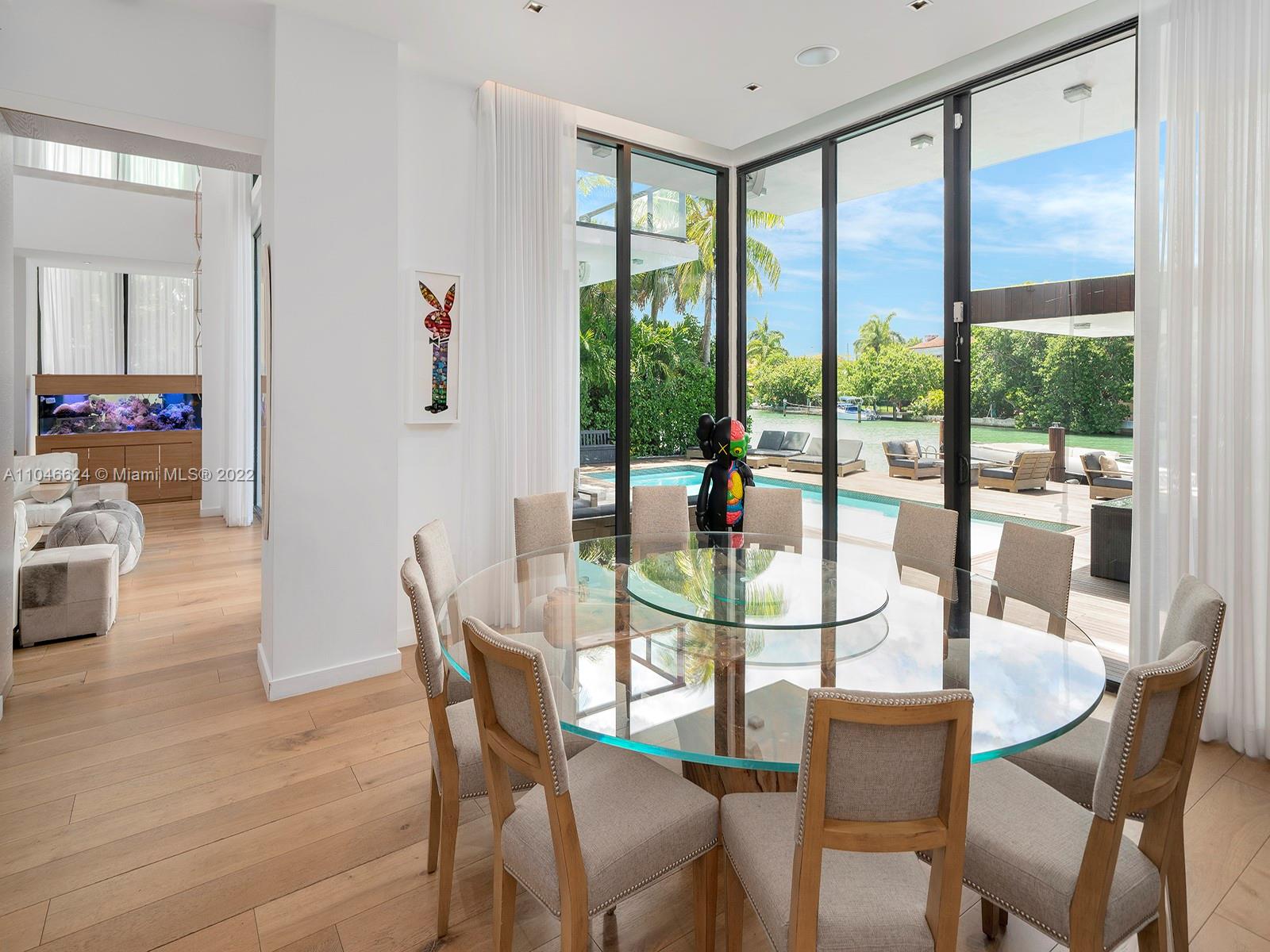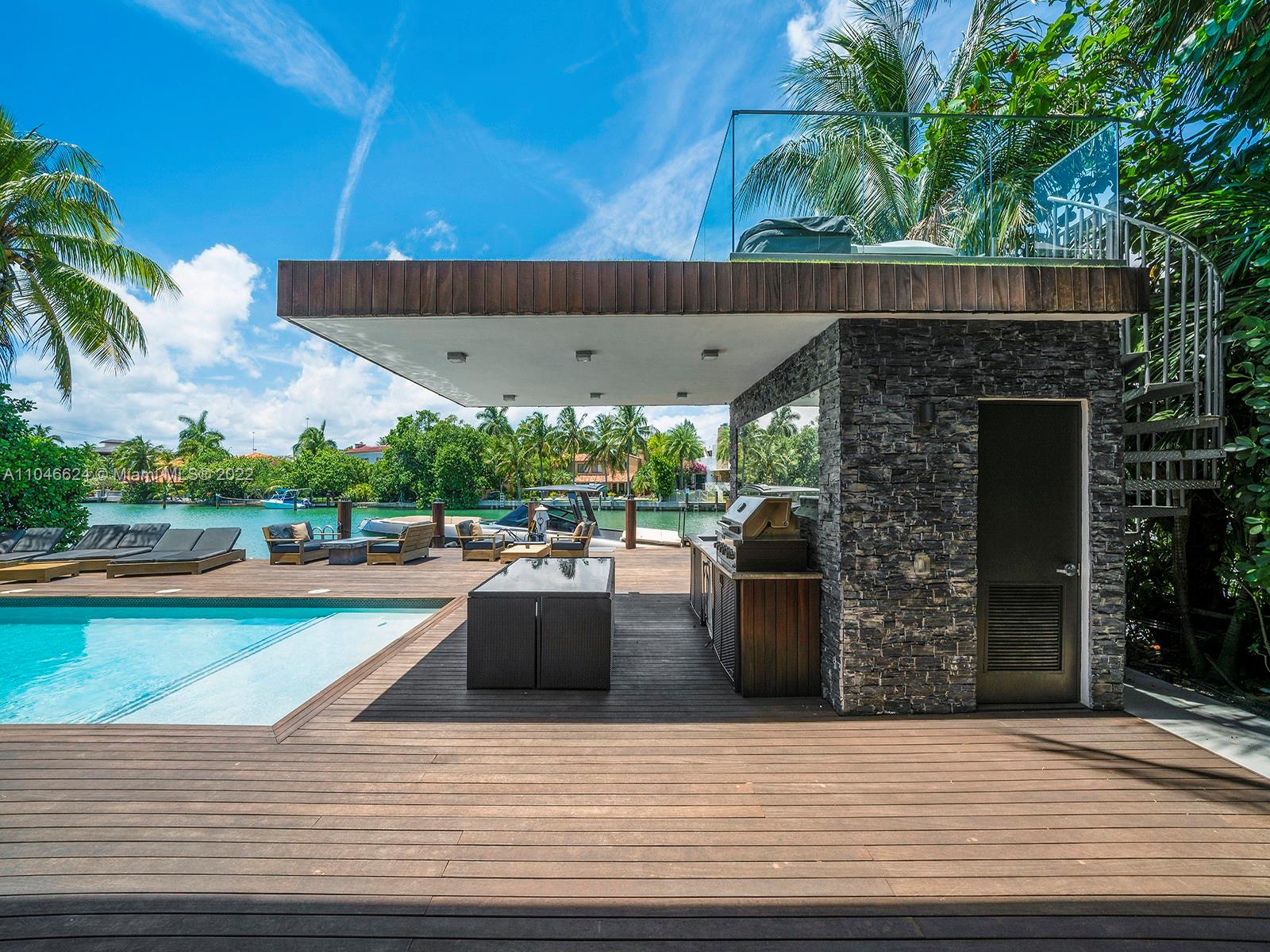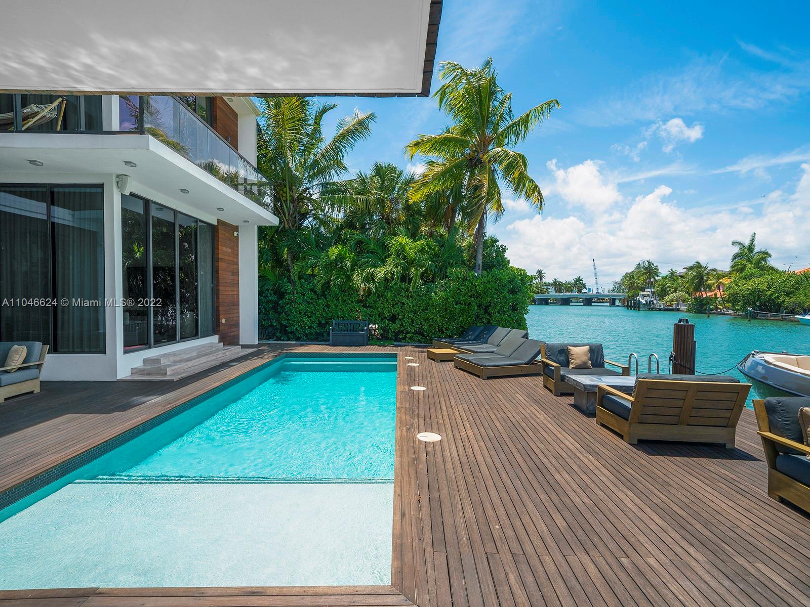 This exquisite contemporary residence, Designed by well-known Cheoff Levy Fishman, was designed to take advantage of its spectacular setting, with the Biscayne Waterway, allowing easy bay access, in the rear, and the Miami Beach Golf Club across the street. Designed as a home for entertaining, indoor and outdoor amenities abound, such as the living room with its 28 foot ceilings, the large waterfront dining room, the chef’s kitchen with Wolf and Subzero appliances and rich marble countertops, the family room in its own pavilion, and the waterfront pool with baja shelf and adjacent summer kitchen, set within a huge ipe wood deck. Upstairs, a large catwalk loft opens to a spectacular master suite with two very large terraces, two dressing rooms, and two water closets.