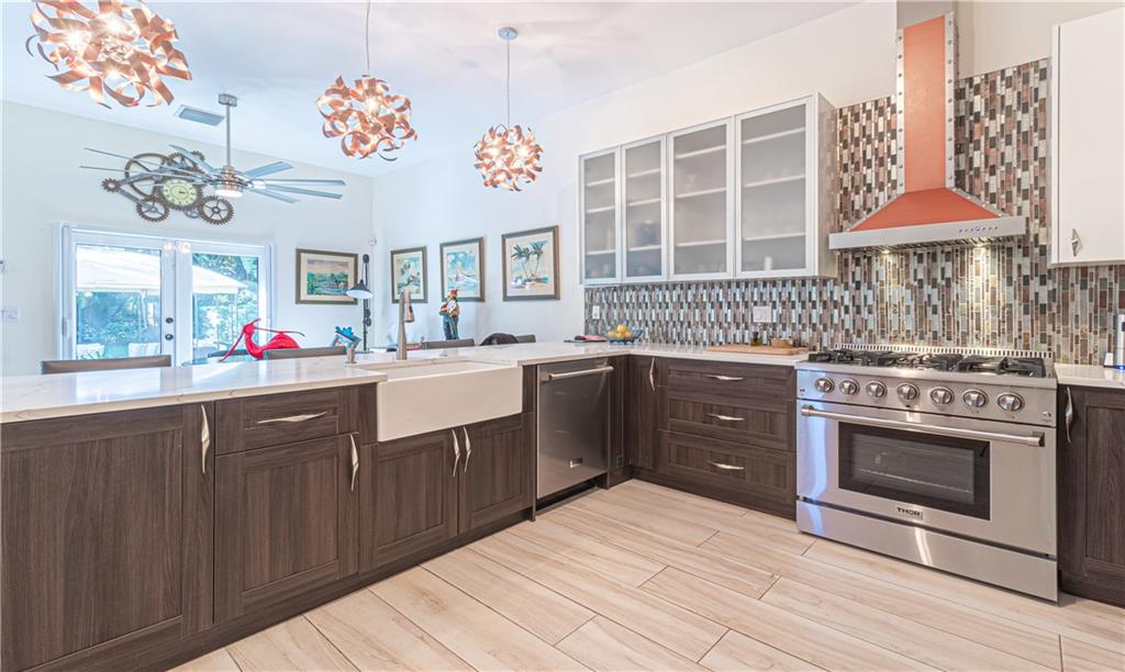 Newly Built 2 bedroom 2 bath pool home w/ garage on a tropically landscaped private lot. A lofty covered front entrance w/ glass double doors welcomes you into this finely appointed home designed by an interior decorator. The expansive living areas offer heightened ceilings, natural light & plenty of room for entertaining. A chef’s delight, modern kitchen equipped w/ Thor appliances including a 6 burning gas range, deep farm house sink, mix of dark & light cabinetry tied together w/ mosaic tiled back splash & solid stone countertops w/ waterfall edge. Impact windows & sliding glass surround the living area, leading out to the private tropical back yard, heated pool, bbq area & covered gazebo! Modern bathrooms featuring rainfall glass enclosed showers, custom closets & beautiful fixtures.