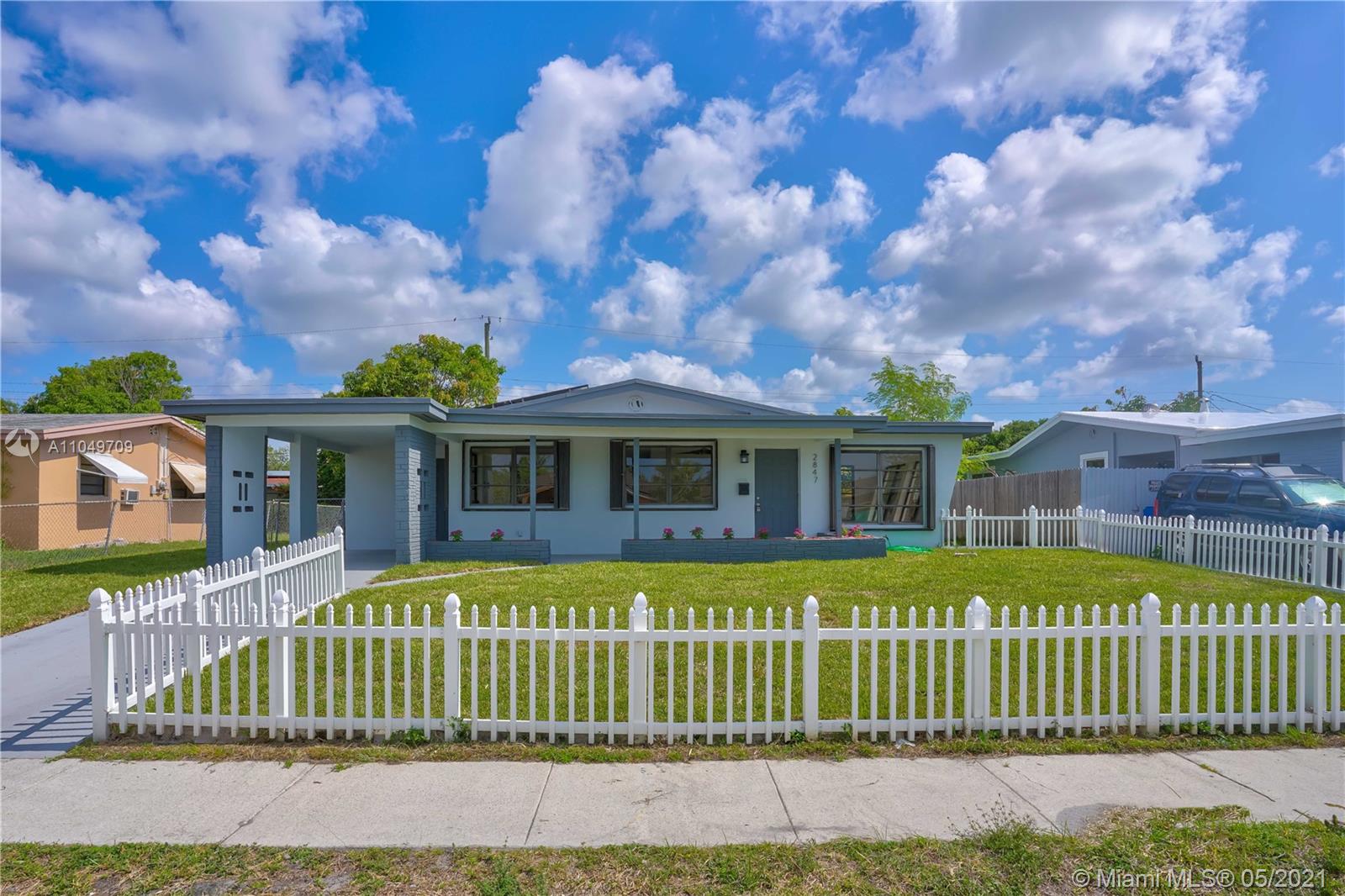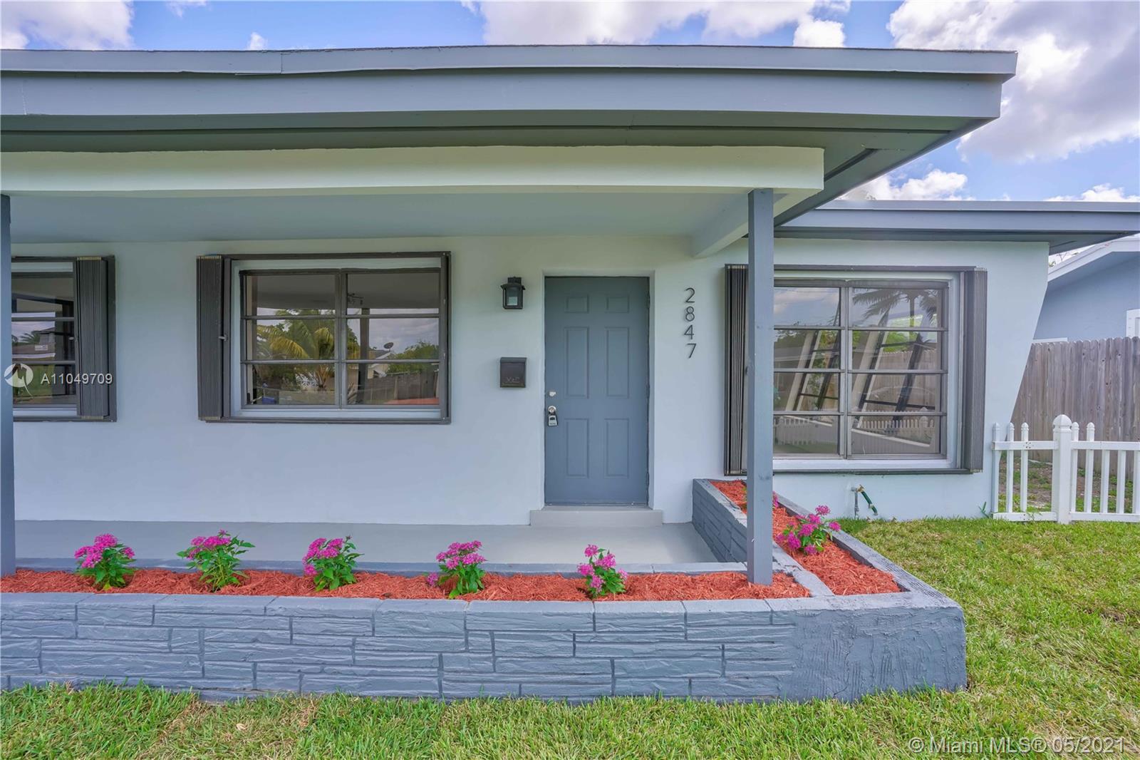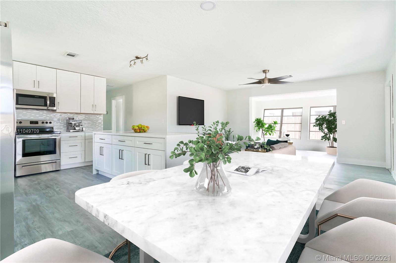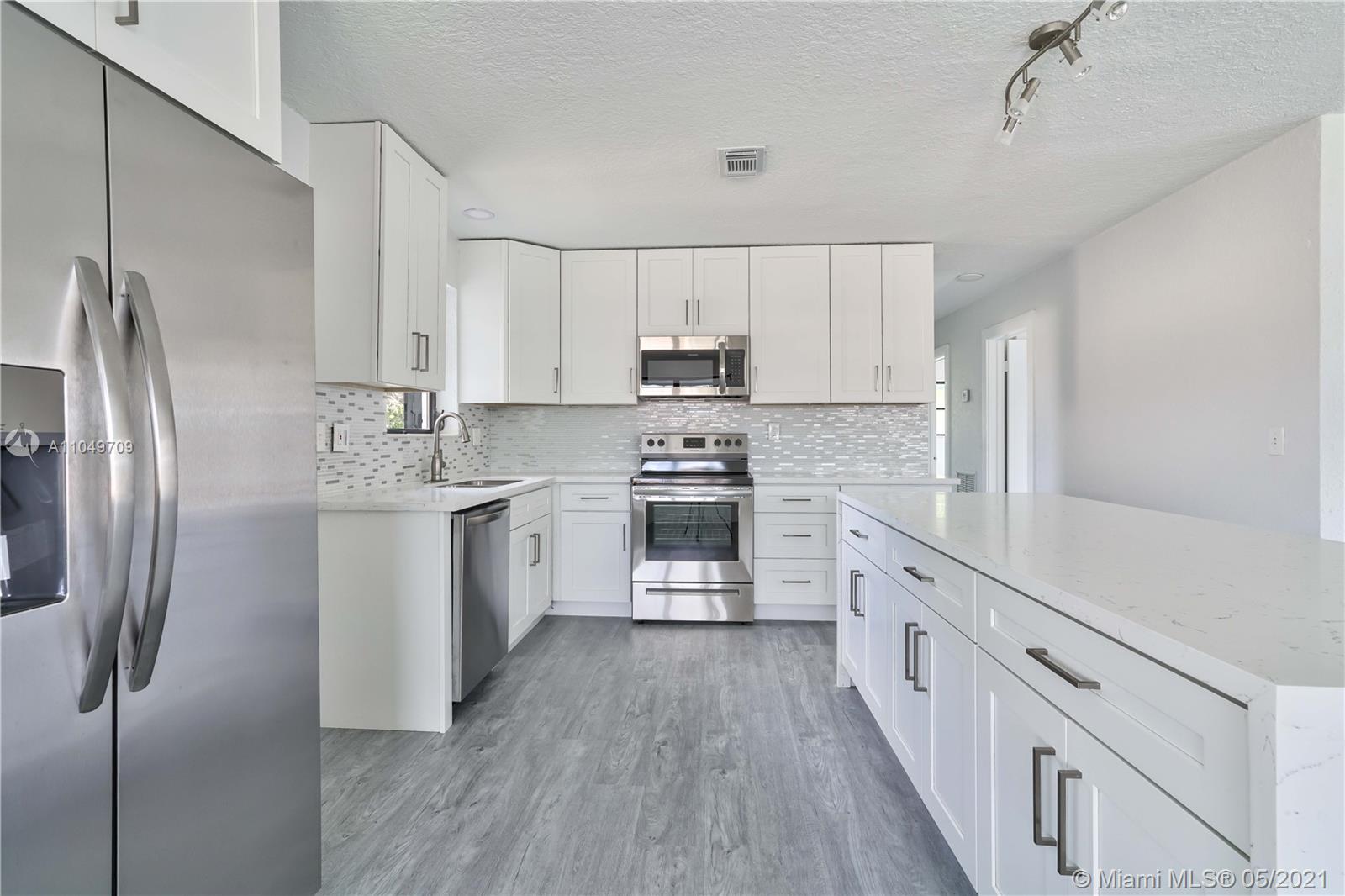 This SFH has been totally remodeled with high end finishes. All new Vinyl Plank Flooring. New Frigidaire Full Set Stainless Steal Appliance Package with Ice Maker. Beautiful new Carrera Quartz Countertops with Carrera Waterfall Island. European Shaker White Cabinets with additional storage. Brand New AC System. Guest bath with all new tile work, trim, flooring, and double vanity with matching Carrera Quartz to the kitchen. Brand new master Shower with matching Carrera Quartz vanity top. Fresh paint inside and out. Brand new Sod in front yard. With full price offer, seller will have all new Sod planted in back yard as well. This house also features Solar Panels that are paid in full. FPL projects a $9.00 electric bill per month. Existing Roof certified for 10 years of life. Will Sell FAST!!