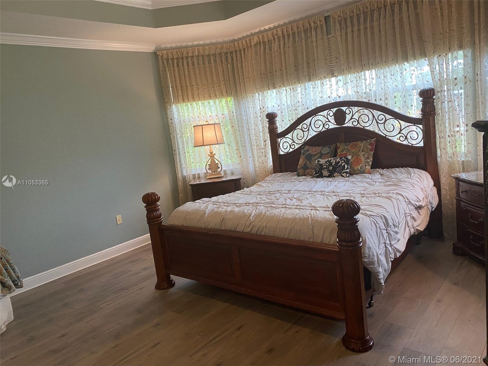 Well maintained single story home within the guard gated community of Sunset Lakes. Original owner, partial lake view w/ a 4/3 layout featuring a true split floor plan. 1 master suite is upon entry, additional 2 bedrooms & 1 bath to the west side of home & large main master suite is located in the rear of the home. Additional rooms include laundry room w/ 3-car garage access, closed den, formal dining, sitting/reading room that can be converted to an additional room & an open kitchen/family entertaining area. Rear master bedroom has 2 walk in closets & master bath that has separate shower/tub, private toilet, double sinks & powder desk. Garden view backyard perfect for entertaining/relaxing, accordion shutters. Community has Olympic size pool, clubhouse w/ gym, playground & tennis.