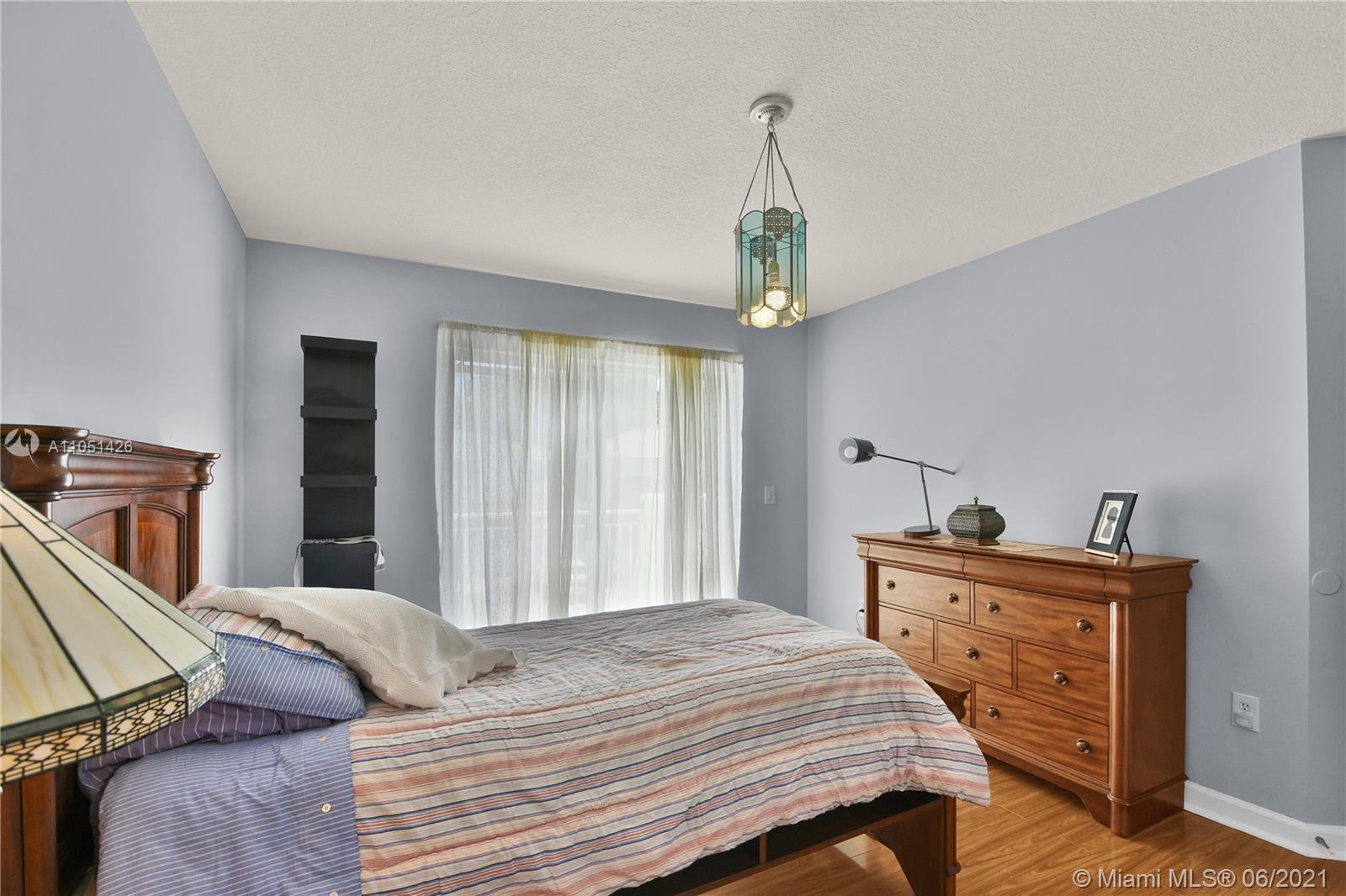 This light-filled home has a semi-private entrance, a wide-front porch where you can sit in the evening and greet neighbors. The living room offers a high ceiling and arched cathedral window that brings in the morning and afternoon light. Two-sweeping balconies, open kitchen, highly practical floor plan, walking closets in master, dual vanities, tiled garage with closets and ceiling storage, and a charming back paved patio with just the perfect size for entertaining & watching the sunset after a long day's work, Accordion Shutters. Goldvue Estates is a bustling & exclusive community in Doral, bike-friendly, 24-hour security, children’s park, pool, low monthly association fee, and it's close to the best dining, entertainment, schools & major expressways & MIA. Best location in Doral!