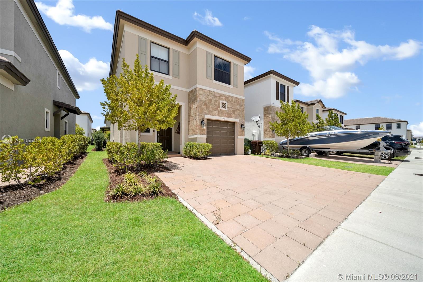 Welcome to Aquabella! This Beautiful guard gated resort style community has sold out of single family homes! This sought after model is practically brand new as its only One & 1/2 years new! The Solis model is very sought after as its a 5 Bed 3 baths home which features a full bedroom & full bathroom on the 1st floor, perfect for visitors or elderly family members. It boasts an spacious open floor plan with a center island kitchen & full views of the living and dining areas so that you can entertain friends & family as you're cooking! Laundry is conveniently located on the 2nd floor. The cozy back patio has extended pavers & covered aluminum awning for cool relaxation! Ring camera doorbell & keyless entry at front door. The clubhouse is as if your at a tropical resort! Can't miss this one!