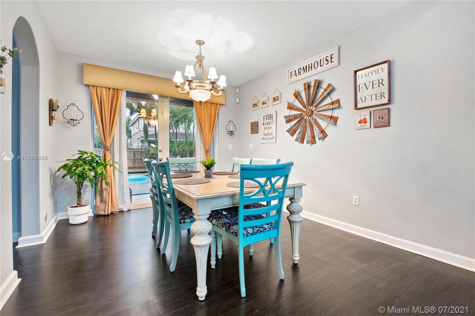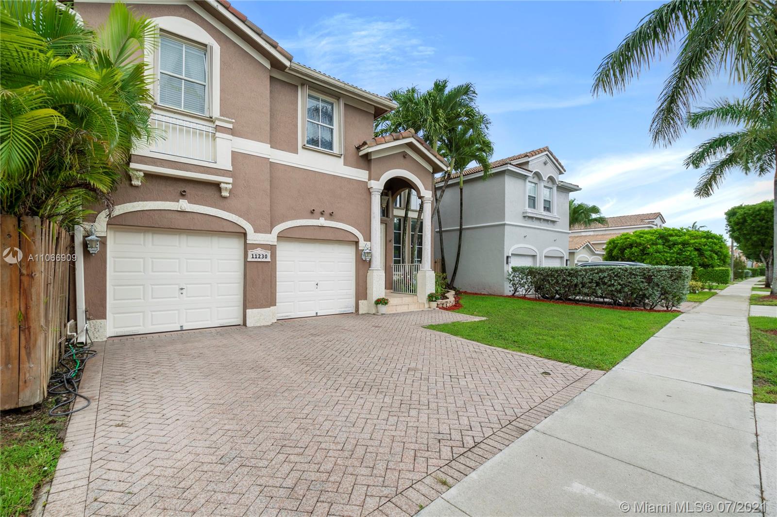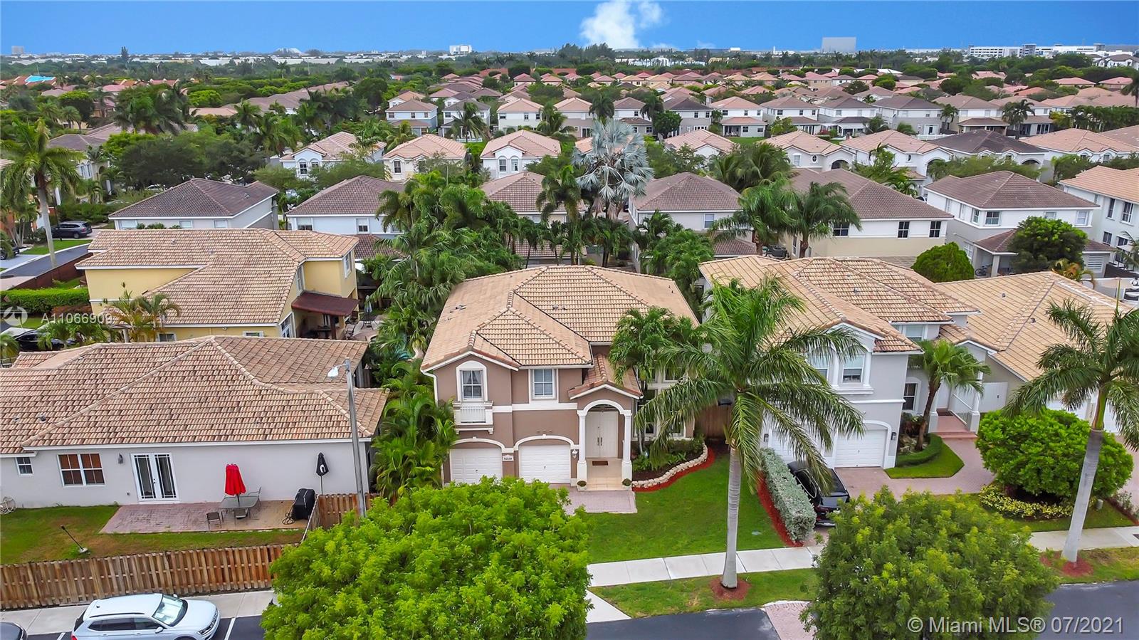Costa Bonita, a Gated community in Doral. Mediterranean 2-story style home with private pool. Good location in move in condition. Expresso wood laminate floors throughout. Freshly painted interiors, crown moldings. New kitchen cabinets with granite counters and all stainless steel appliances. 2nd floor master suite with huge walk in closet and bathroom. Generous sized bedrooms, all upstairs. Accordion shutters for hurricane protection. Pool with surrounding brick pavers and awning, pool fence, rain gutters. Low monthly maintenance fee of $ 175.00 a month.