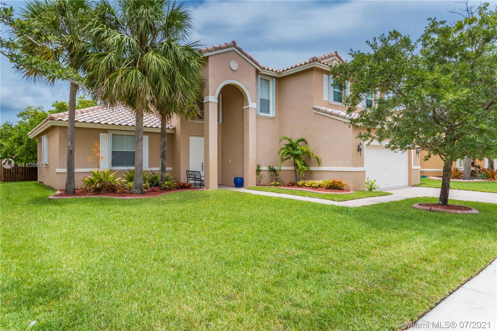 SPECTACULAR SOARING CEILINGS AS YOU ENTER THIS INVITING, SPACIOUS 5 BDRM, 3 1/2 BATH HOME IN 24 HR GUARD GATED COMMUNITY! KITCHEN FEATURES SS APPLIANCES, SNACK BAR & 2 DOUBLE CABINETS W/ PULL OUT DRAWERS.2 MASTER BDRMS - 1 UPSTAIRS & 1 DOWN. BOTH W/ PRIVATE BTHRMS. UPPER MSTR BATH HAS HIS/HER SINKS, SEPARATE SHOWER & TUB.UPPER LEVEL HAS 4 BEDROOMS & 2 BATHS. HUNTER DOUGLAS WINDOW COVERINGS IN DINING & LIVING ROOM. SEPARATE OVERSIZED DINING ROOM. EXTRA LARGE FAMILY ROOM HAS PLANTATION SHUTTERS. 1/2 BATH OFF FAM RM THAT OPENS TO BACKYARD. HUGE LAUNDRY ROOM WITH SINK. COVERED PATIO IS PERFECT FOR BBQ'S IN ANY TYPE OF WEATHER. PLENTY OF ROOM FOR A POOL. ENTIRE HOUSE IS PROTECTED BY ACCORDION SHUTTERS. RESORT STYLE COMMUNITY WITH POOL, PARTY ROOM, GYM, TENNIS & BASKETBALL COURTS AND PLAYGROUND.