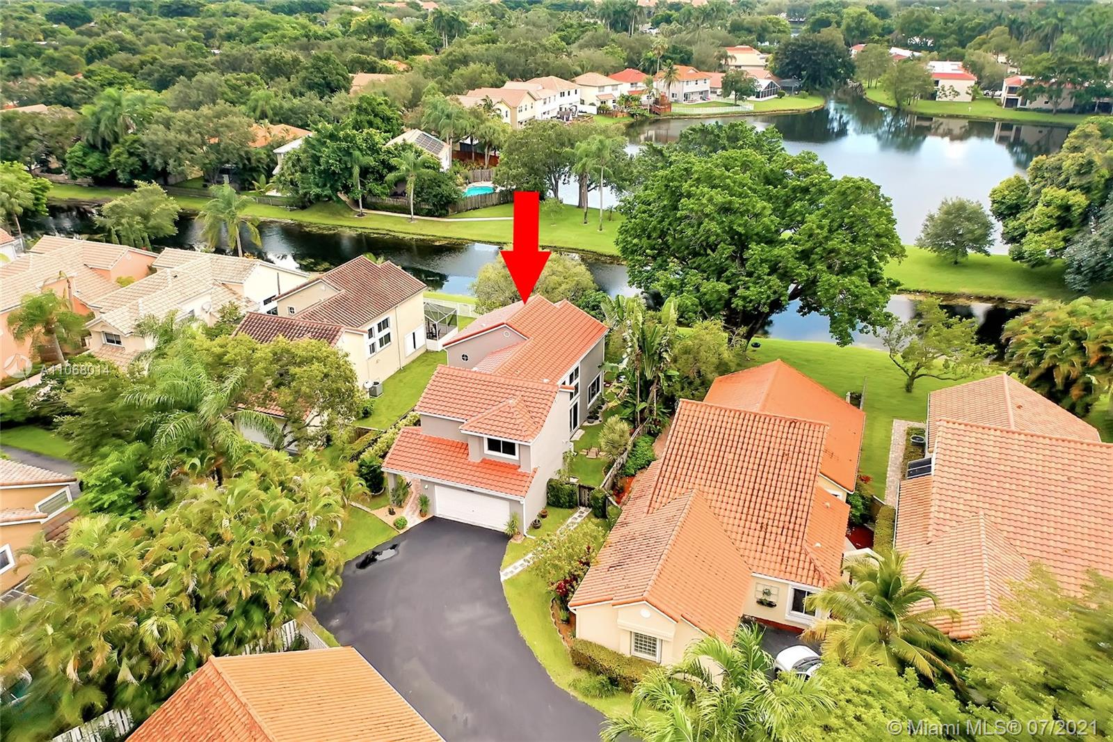 Beautiful waterfront home situated at the end of a long private driveway offers plenty of parking, privacy w/an outdoor garden oasis & mango tree. Welcomed by a waterfall feature, the soaring living room ceiling greets you with an abundance of natural light as you enter this lovely home. An open floor plan, this 2 story home has a master bedroom overlooking the water w/ two bedrooms opposite the loft area, currently used as an office. A terrific breakfast area & family room overlooks the stunning backyard. New roof (1 yr old), gutters and freshly painted, it is welcoming from the moment you walk down the stone filled pathways to the front door. Maintenance free, the HOA provides landscaping, tree trimming, sprinklers & a heated community pool. This coveted guard gated community is a gem.