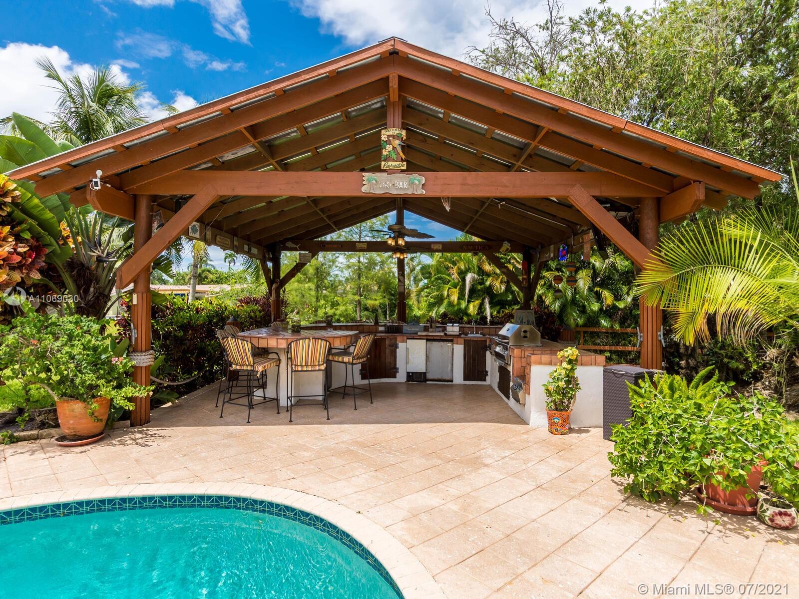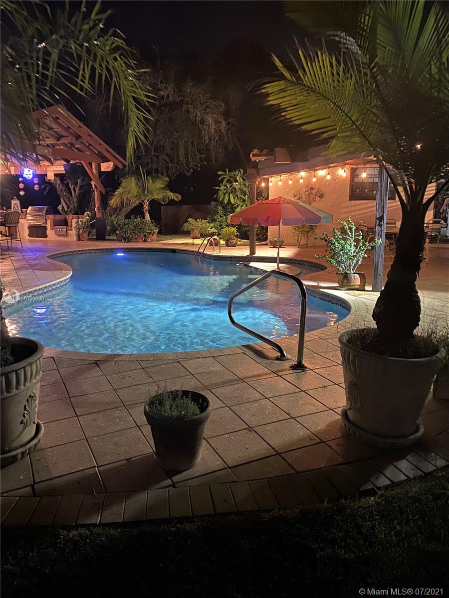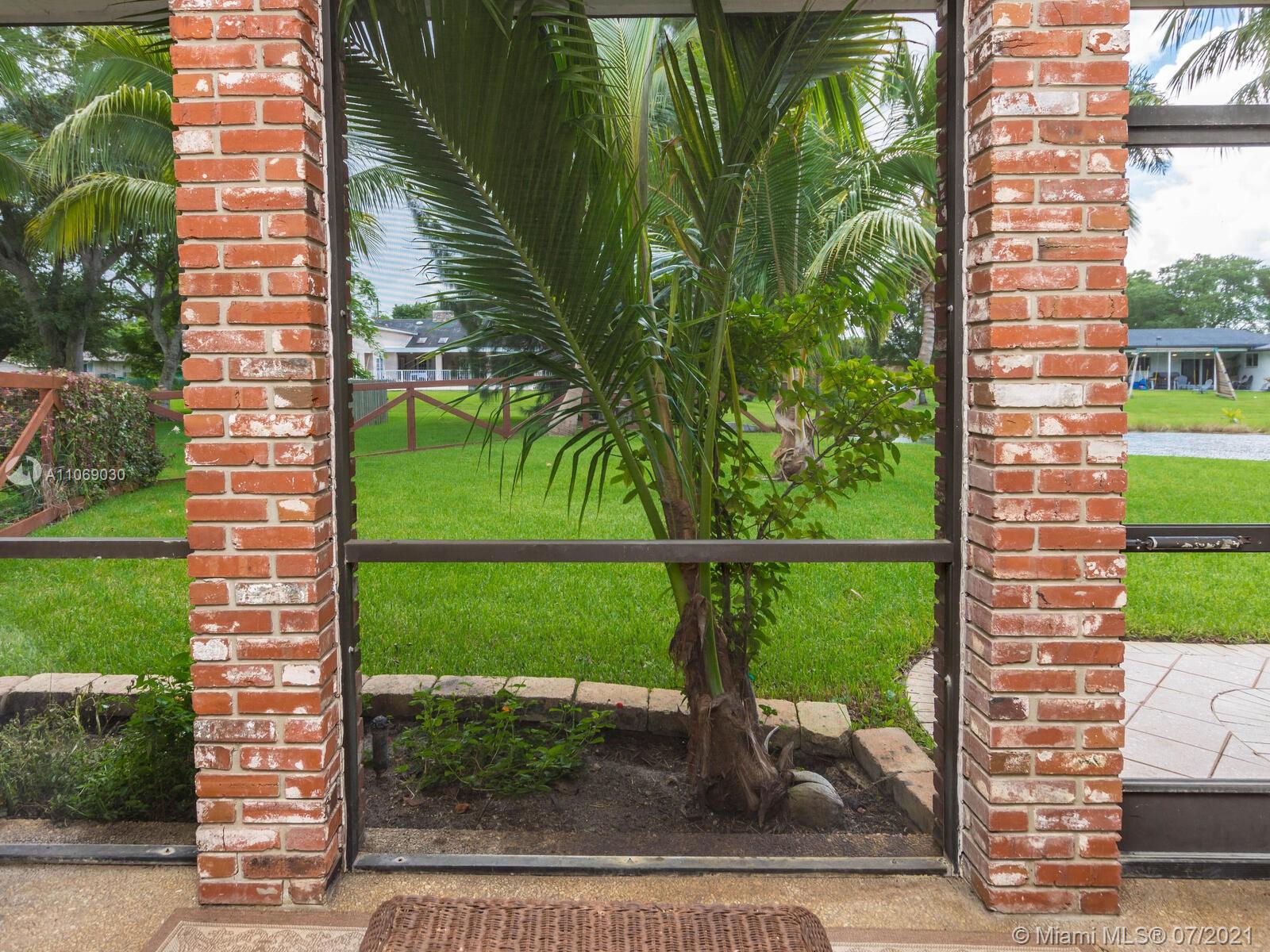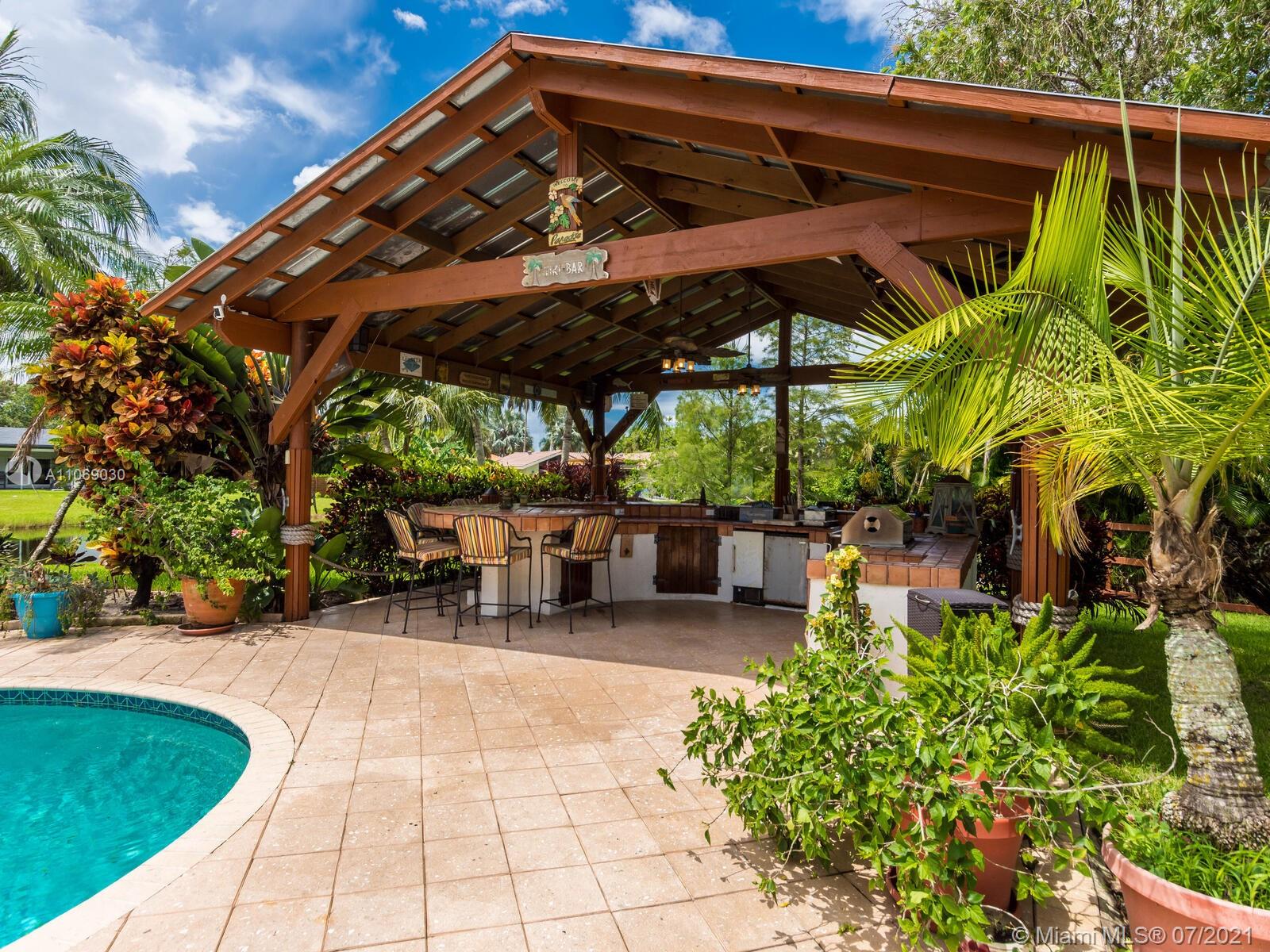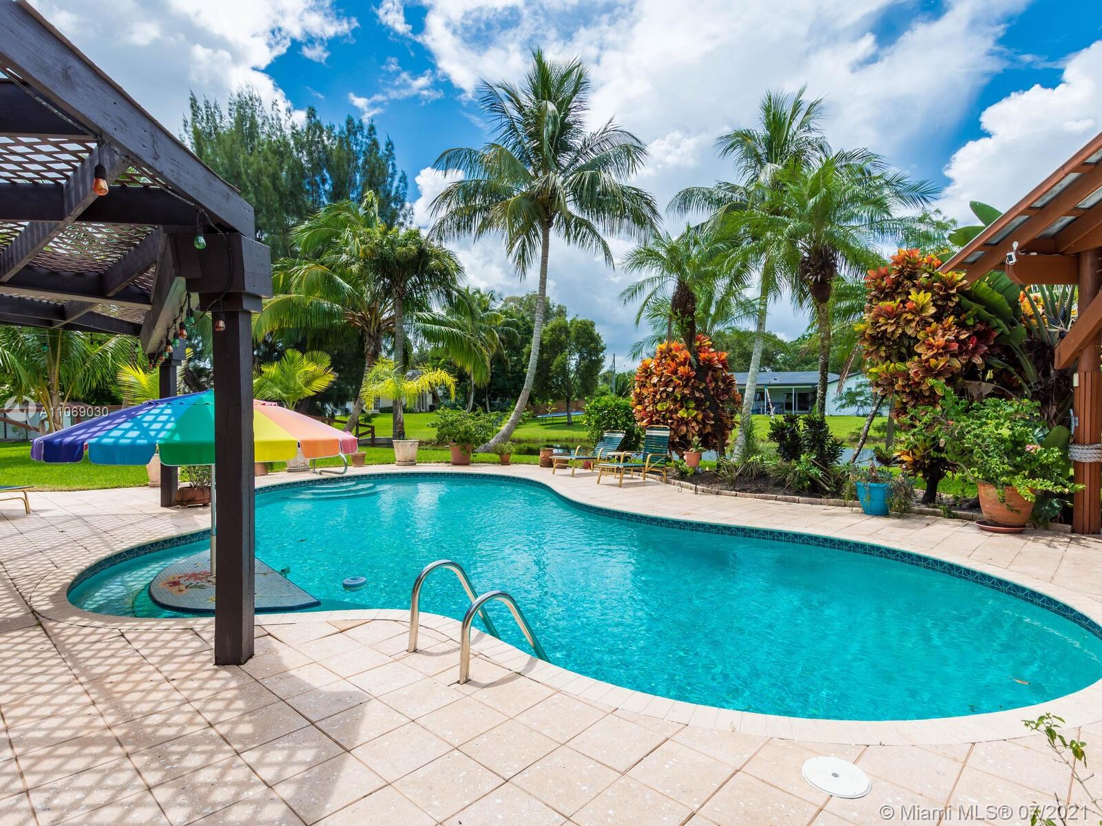 Amazingly unique three bedroom three bath two story home carefully designed to bring forth the best of old world charm. Bask in the pool surrounded by a tropical waterfront paradise on over ½ an acre with party size covered entertainment area with barbeque grill, electric, water, and so much more. Home also offers Impact windows and doors and fabulous flooring throughout. The additional storage building offers electricity and wall a/c for your comfort, whether as an office, home gym, or other. Desireably situated in Plantation Acres near American Heritage School. This beautiful home can be yours! Love it just the way it is or personalize it with your own creative updates. Showings by Appointment Only.