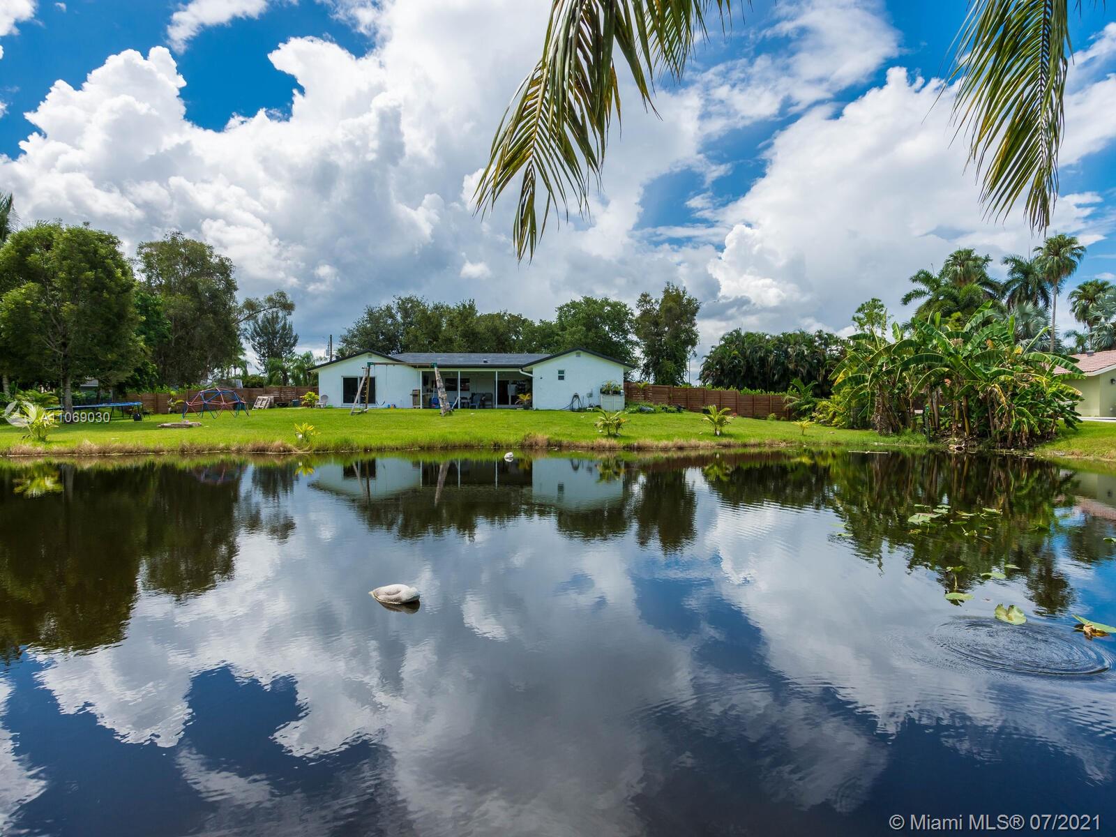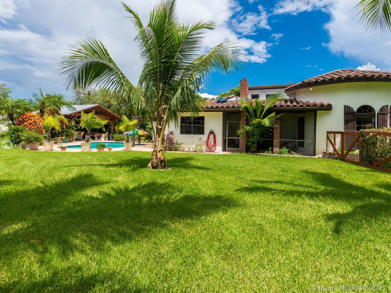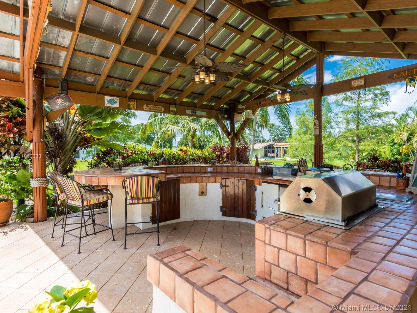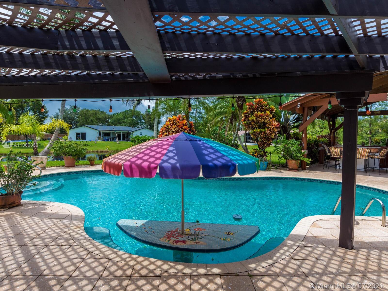 Amazingly unique three bedroom three bath two story home carefully designed to bring forth the best of old world charm. Bask in the pool surrounded by a tropical waterfront paradise on over ½ an acre with party size covered entertainment area with barbeque grill, electric, water, and so much more. Home also offers Impact windows and doors and fabulous flooring throughout. The additional storage building offers electricity and wall a/c for your comfort, whether as an office, home gym, or other. Desireably situated in Plantation Acres near American Heritage School. This beautiful home can be yours! Love it just the way it is or personalize it with your own creative updates. Showings by Appointment Only.